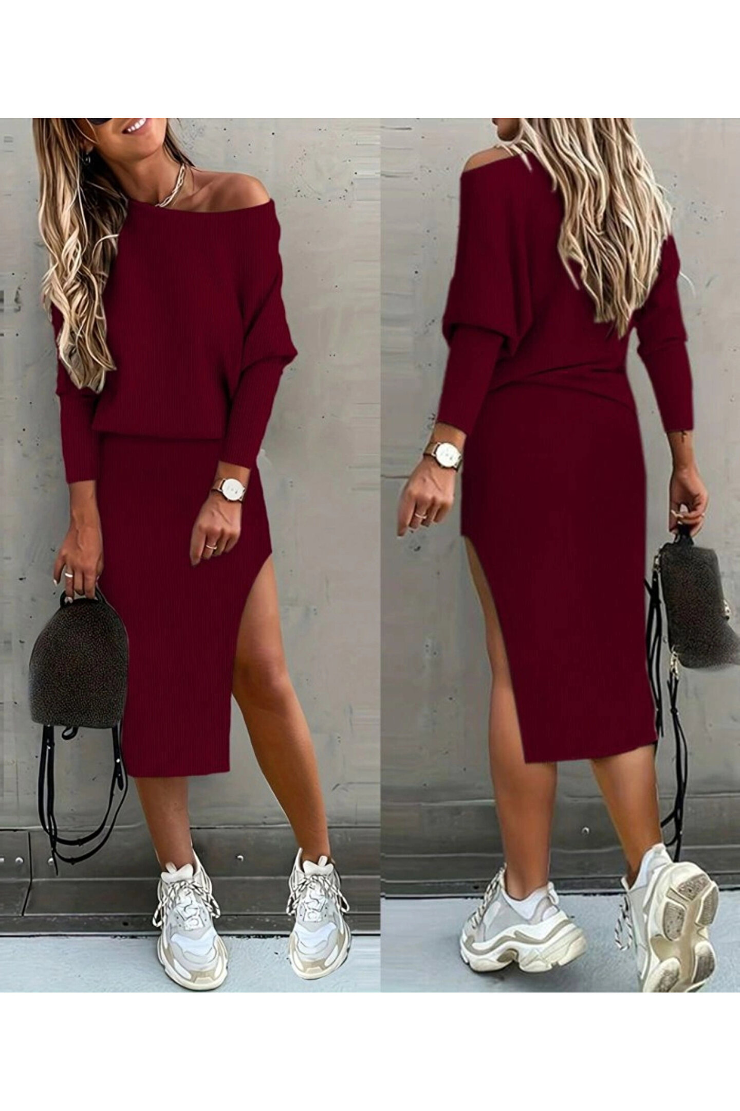 Kadın Uzun Kollu Düşük Omuz Yırtmaç Detay Kaşkorse Etek Bluz Ikili Takım
