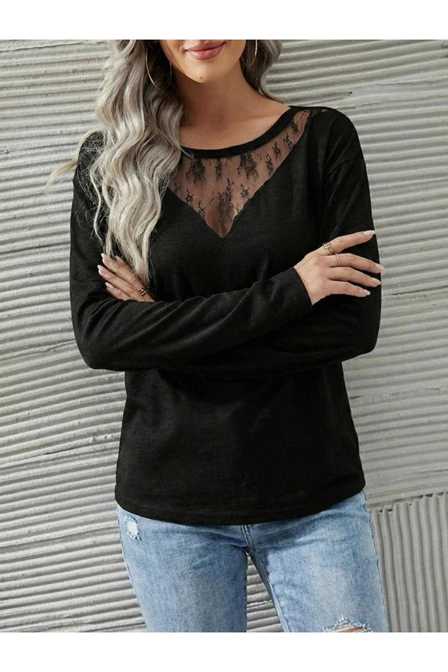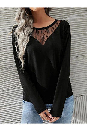 Kadın Uzun Kollu Geniş Yuvarlak Yaka Dantelli Viskon Iki Iplik Bluz