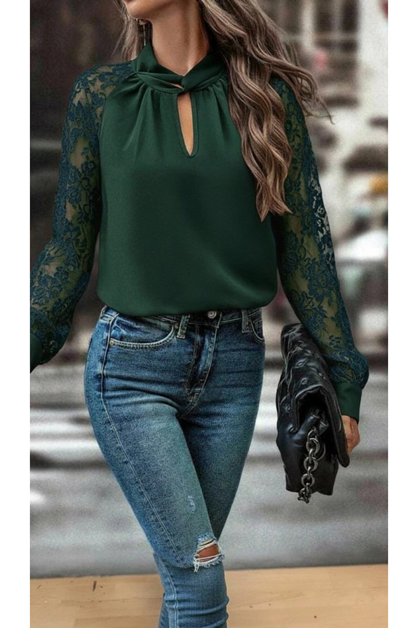 Kadın Uzun Kollu Göğüs Pencere Detay Yaka Boğazlı Kolları Tüllü Sandy Bluz