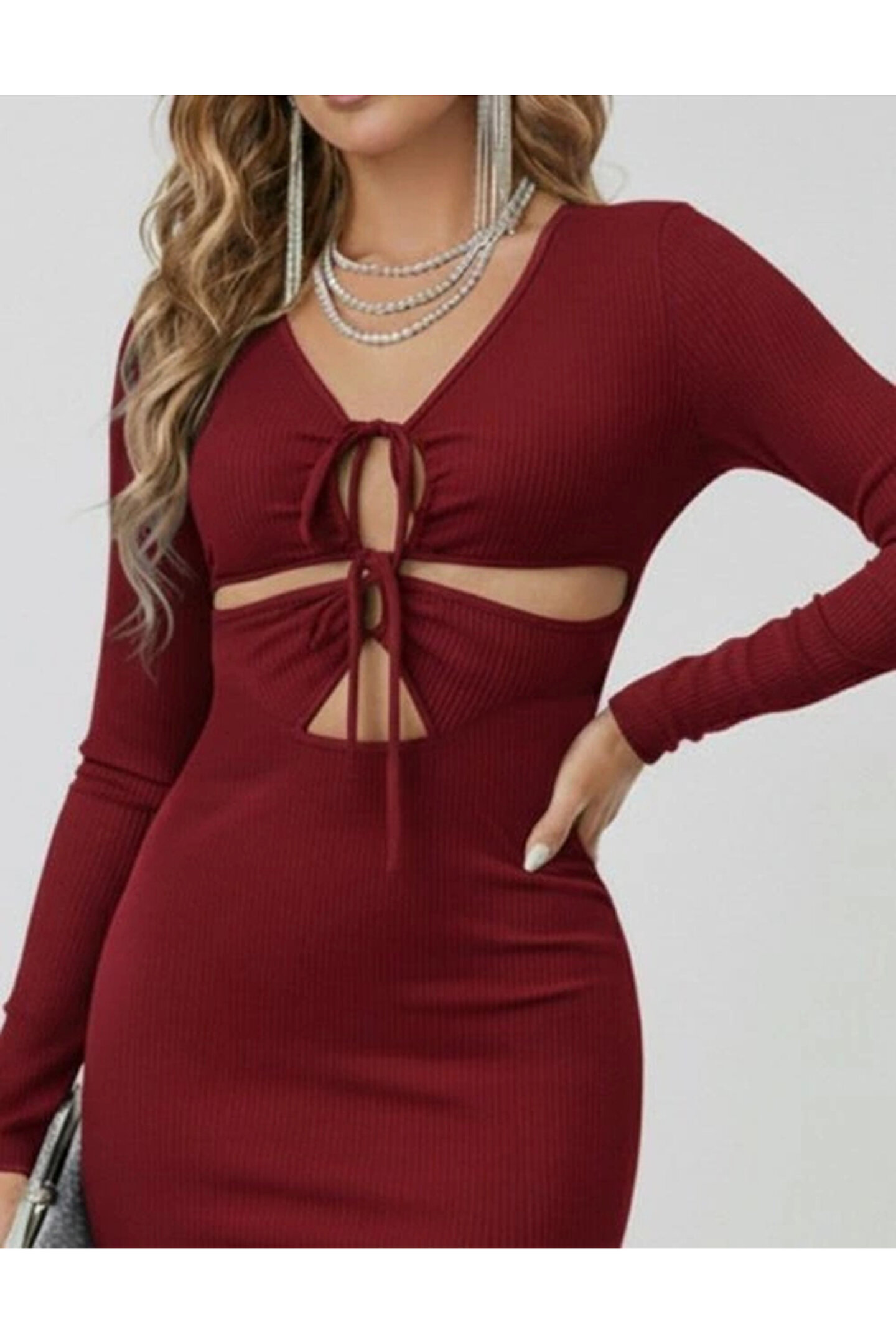 Kadın Uzun Kollu Göğüs Ve Göbek Dekolte Detay Sandy Midi Boy Elbise