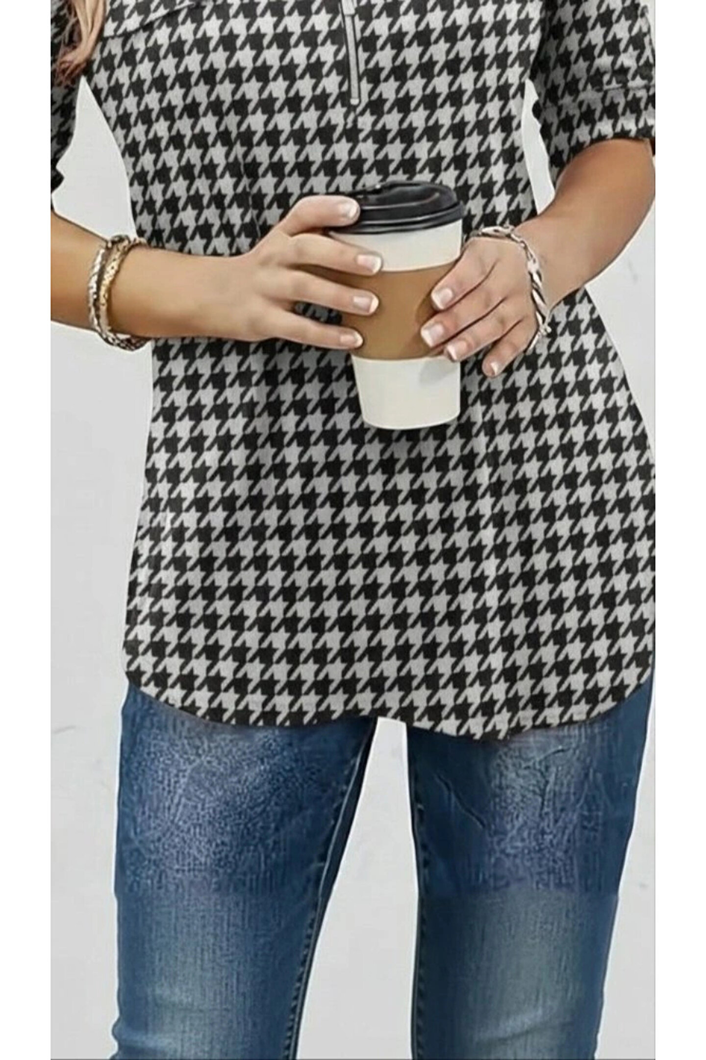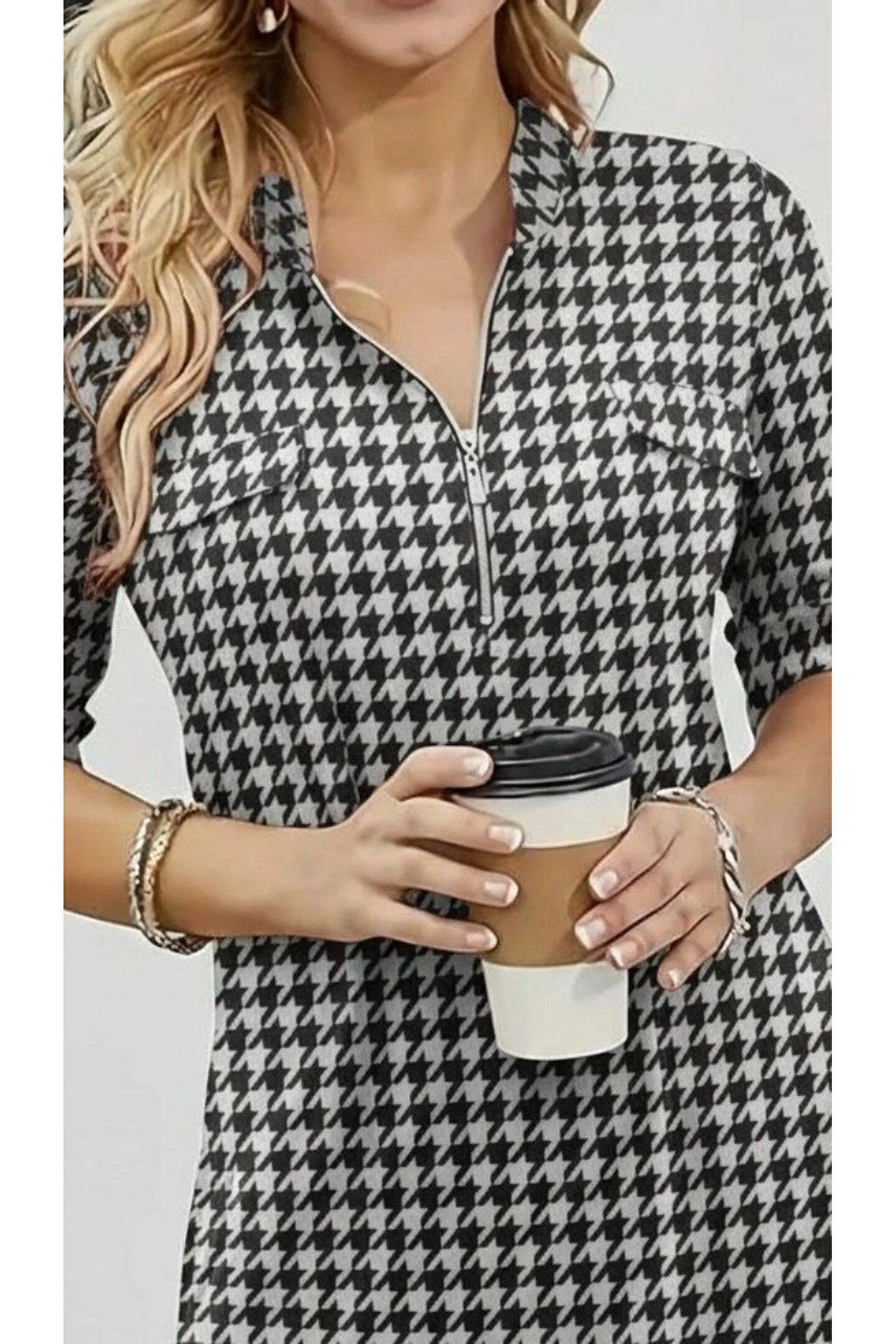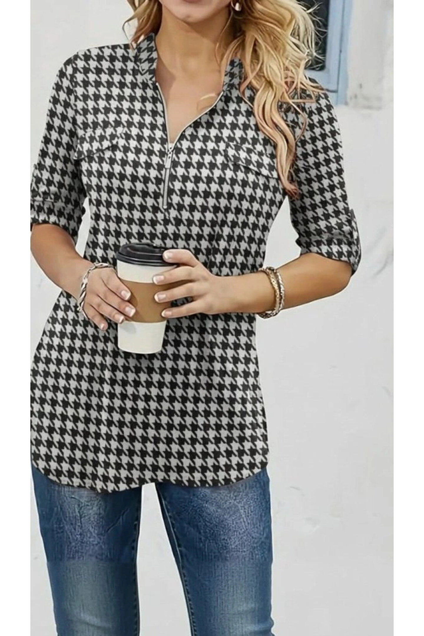 Kadın Uzun Kollu Hakim Yaka Yakadan Fermuarlı Geometrik Desenli Süprem Bluz