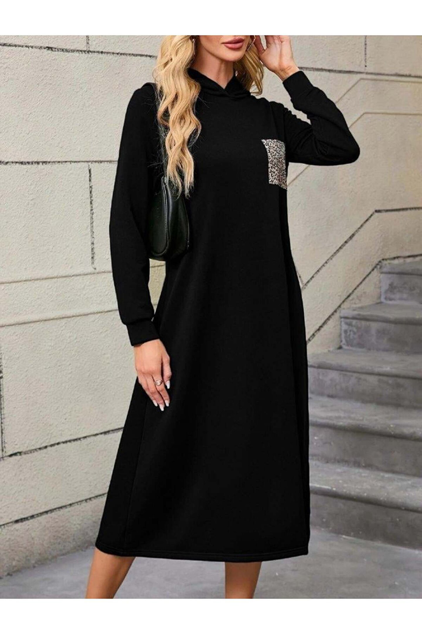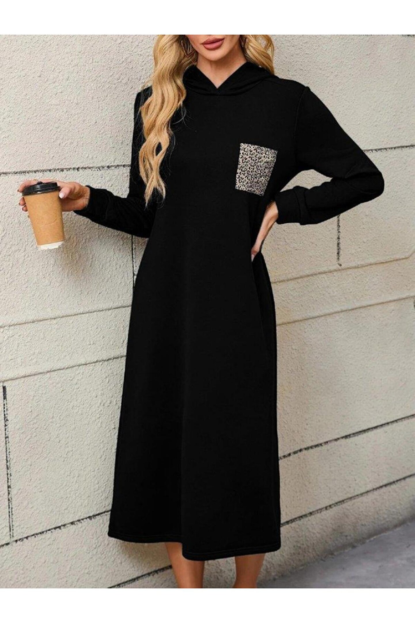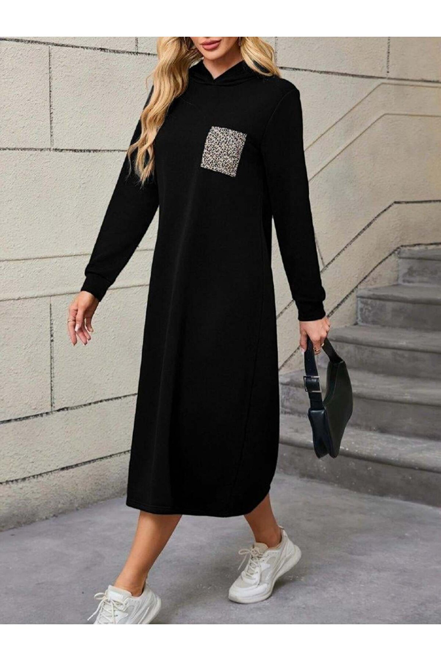Kadın Uzun Kollu Kapşonlu Cep Detaylı Viskon Iki Iplik Maxi Elbise
