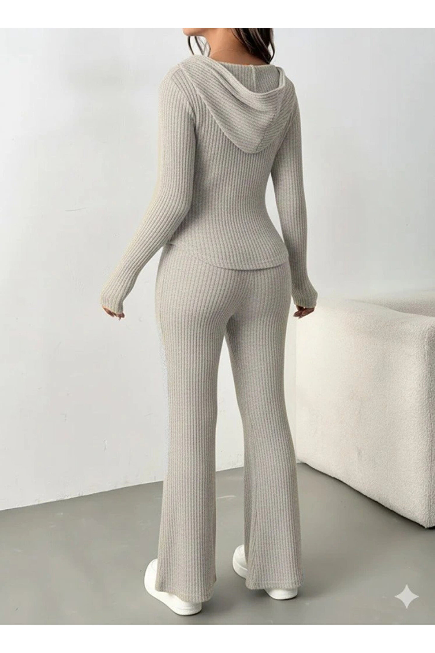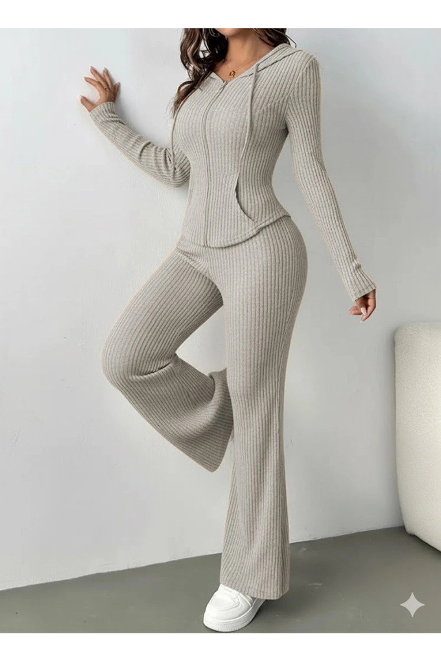 Kadın Uzun Kollu Kapşonlu önden Fermuarlı Kaşkorse Bluz Ve Pantolon Ikili Takım