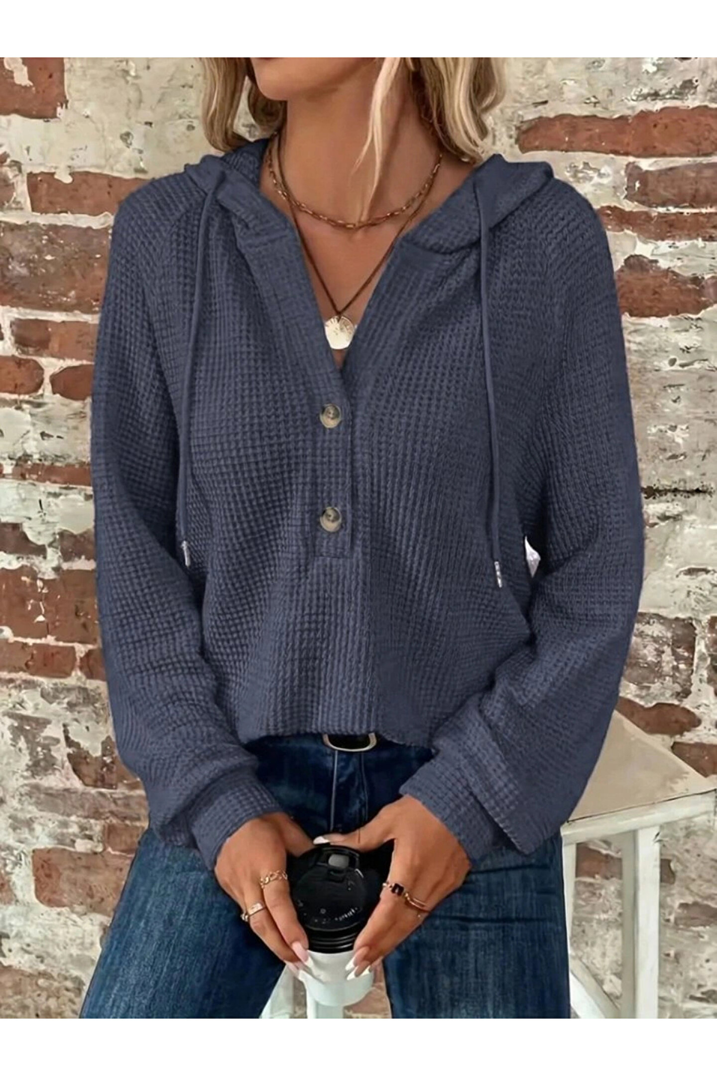 Kadın Uzun Kollu Kapşonlu önü Düğmeli Ve Bağcıklı Waffle Bluz