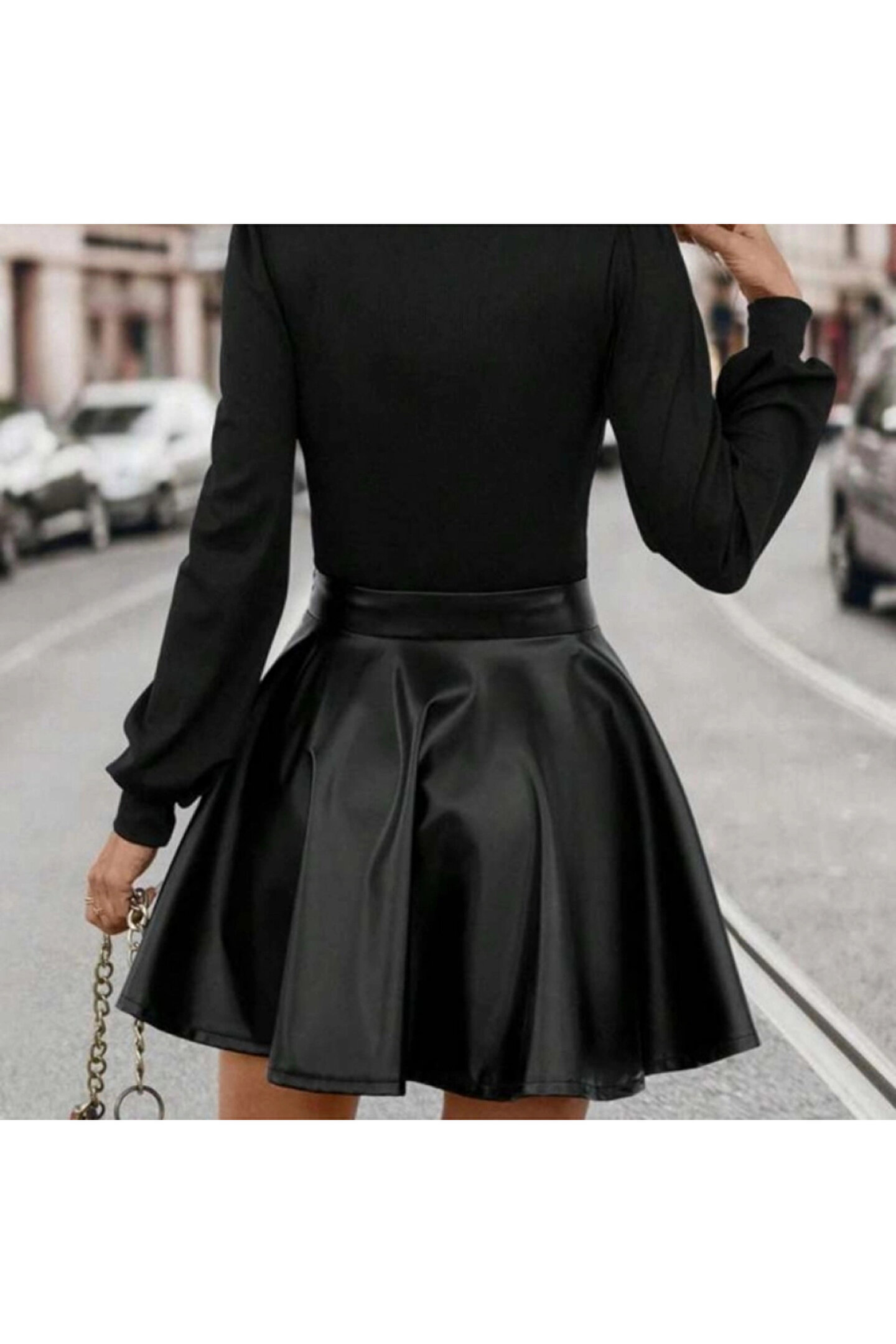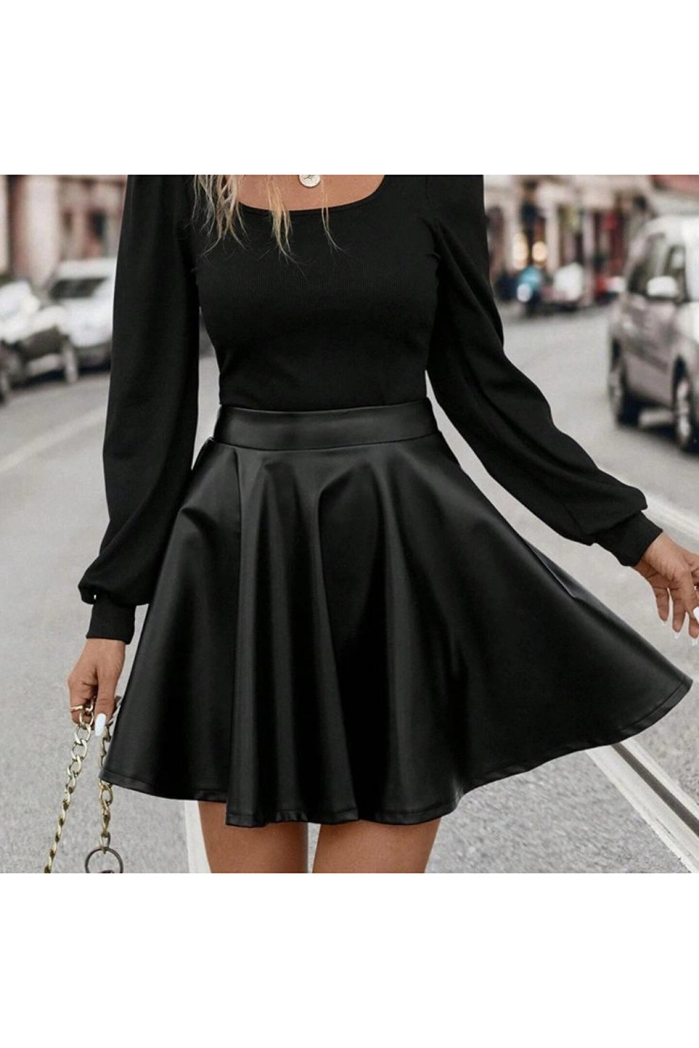 Kadın Uzun Kollu Kare Yaka üst Viskon Alt Deri Mini Elbise