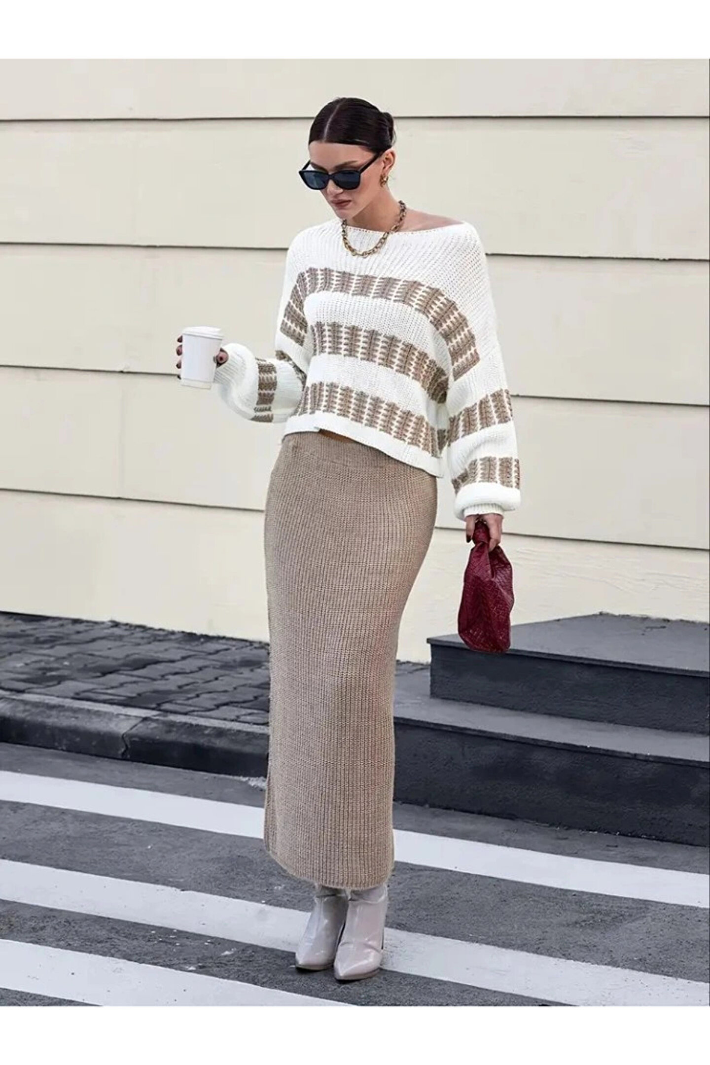 Kadın Uzun Kollu Kayık Yakalı Salaş Triko Bluz Ve Etek Ikili Takım