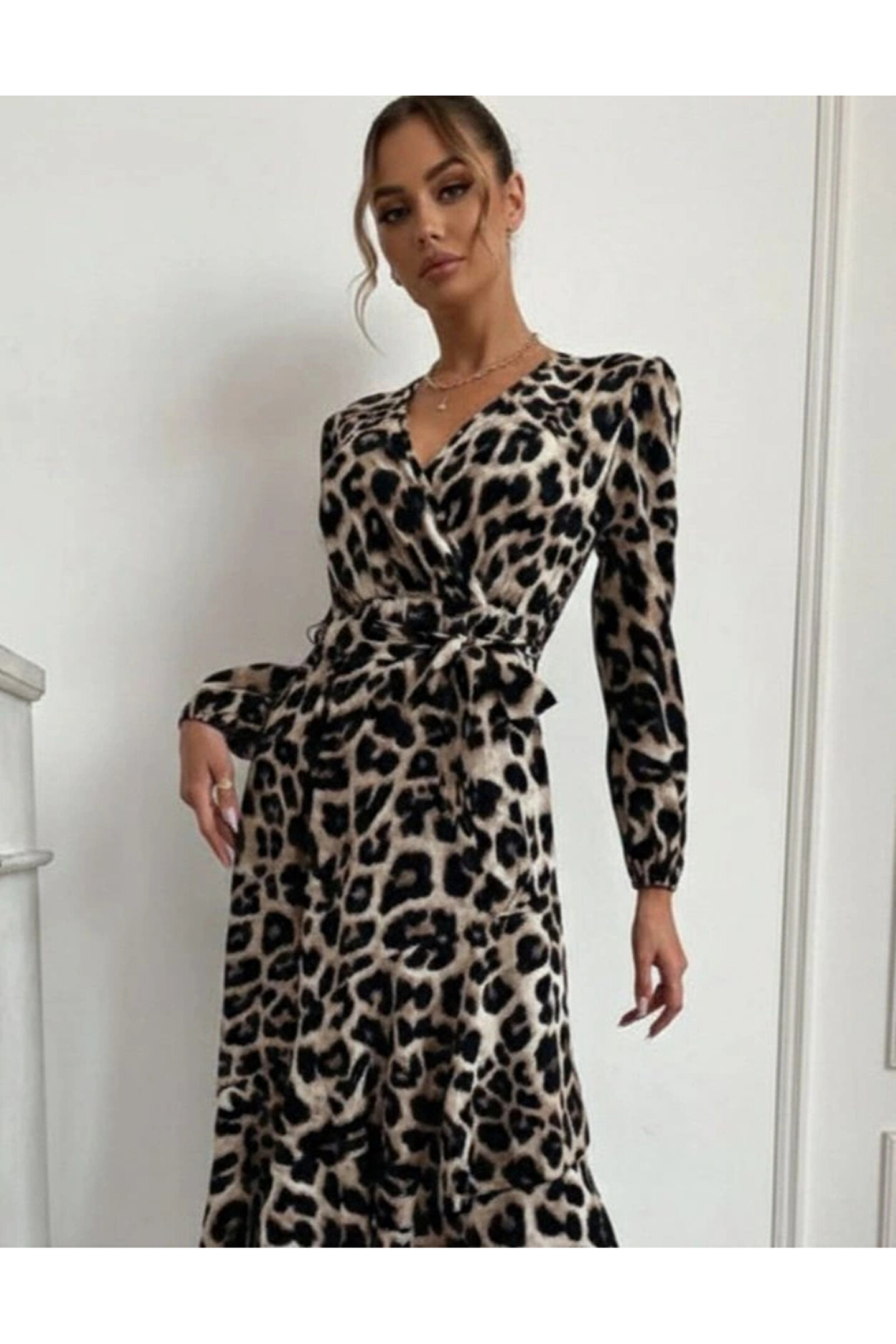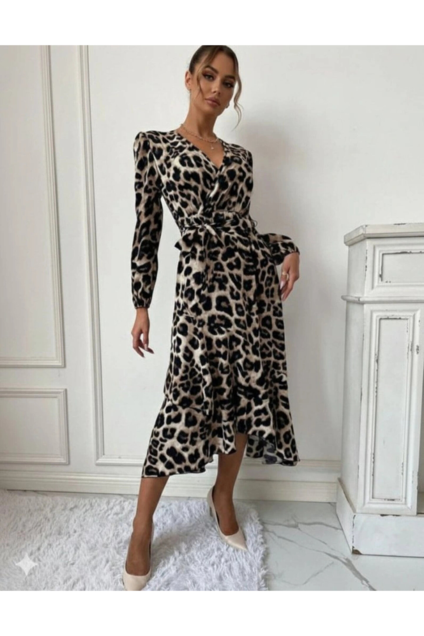 Kadın Uzun Kollu Kruvaze Yaka Yandan Bağlamalı önden Fırfır Detaylı Süprem Uzun Elbise