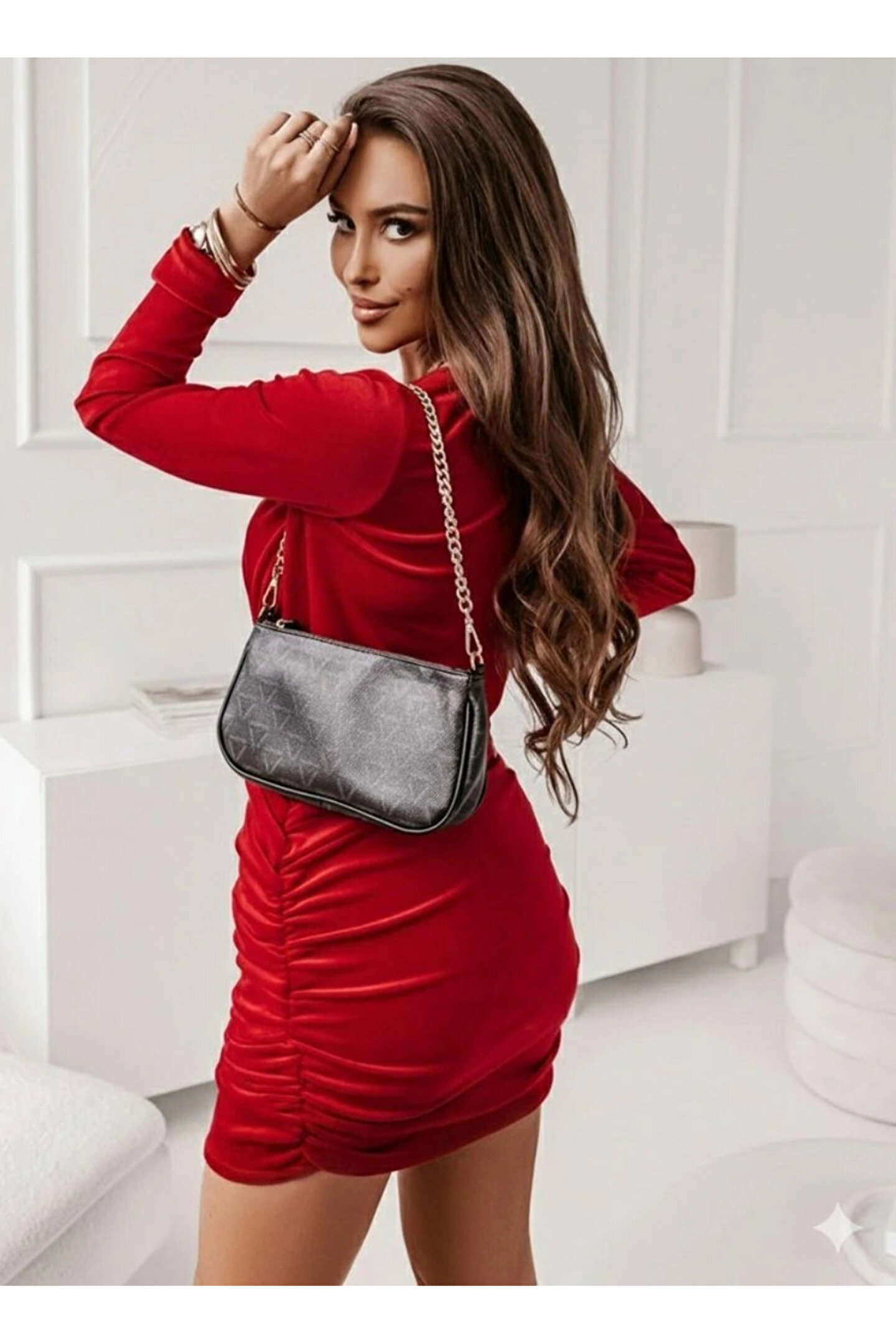 Kadın Uzun Kollu Kruvaze Yaka Yandan Büzgülü Mini Ithal Krep Elbise
