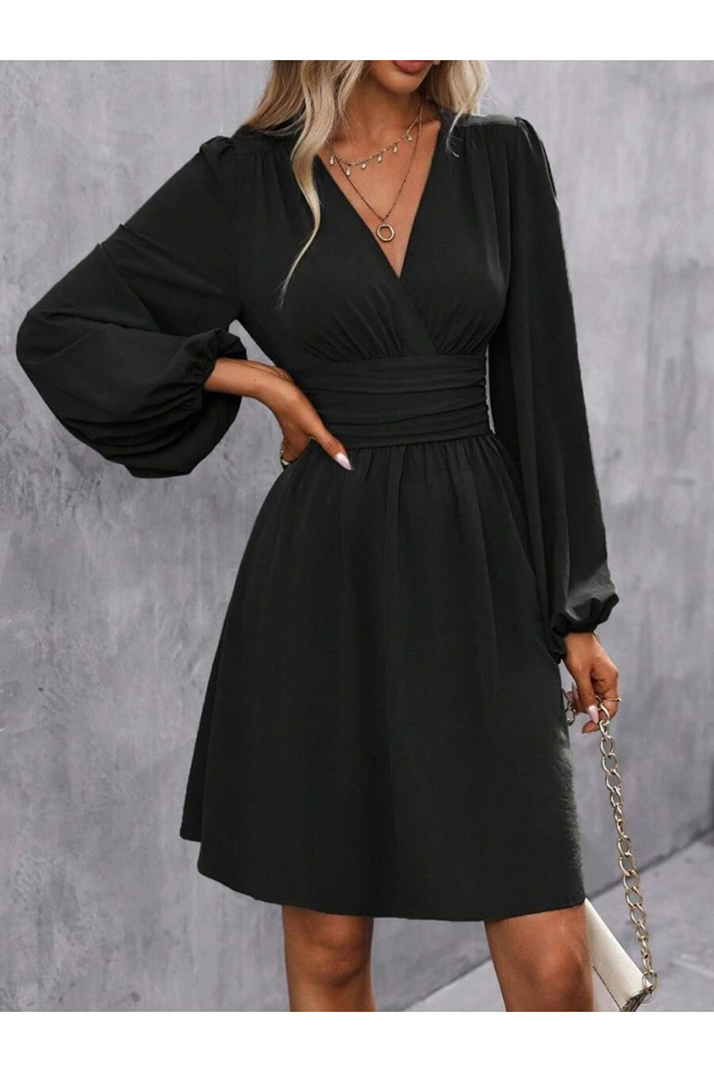Kadın Uzun Kollu Kruvaze Yakalı Bel Korsajlı Mini Elbise