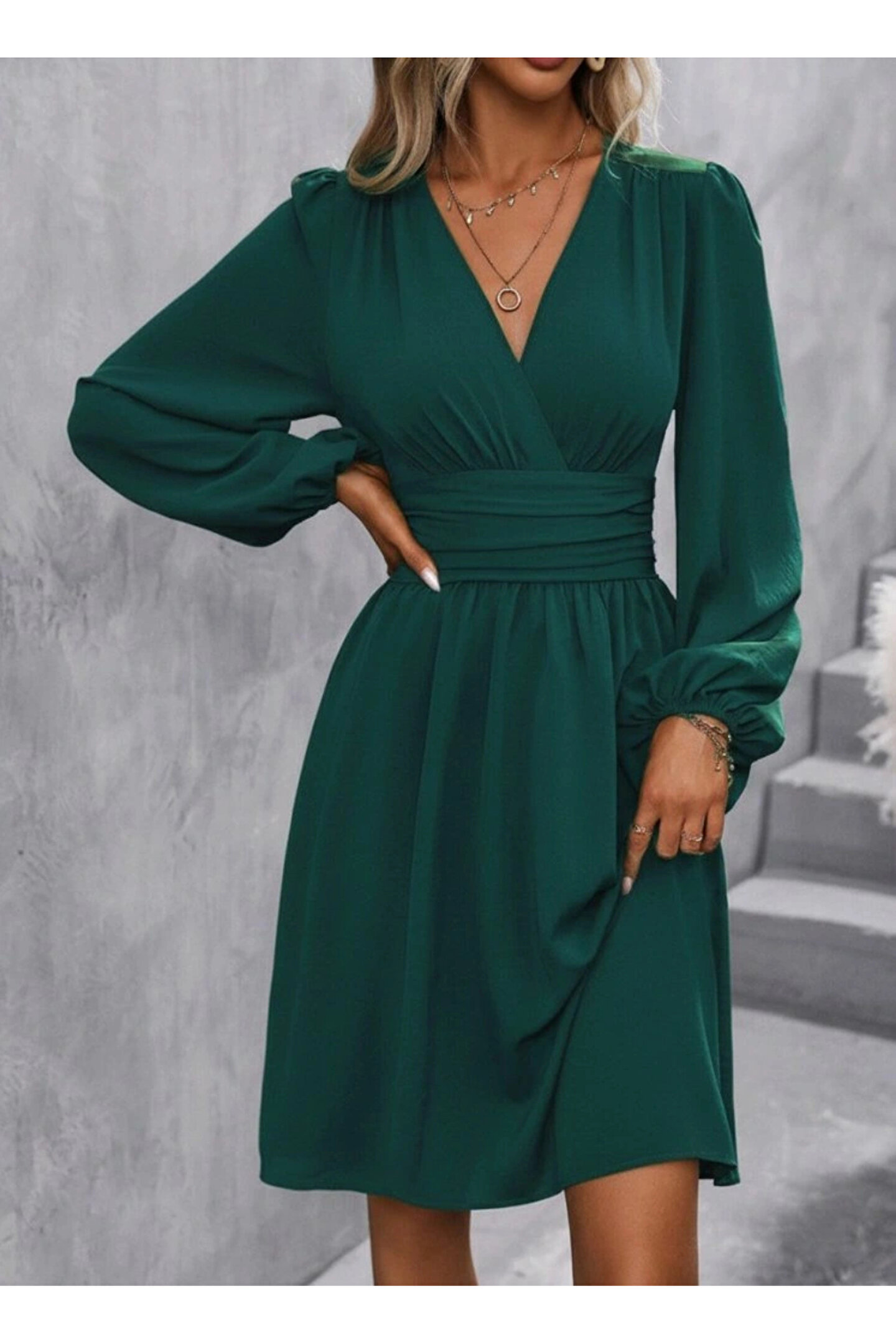 Kadın Uzun Kollu Kruvaze Yakalı Bel Korsajlı Mini Elbise