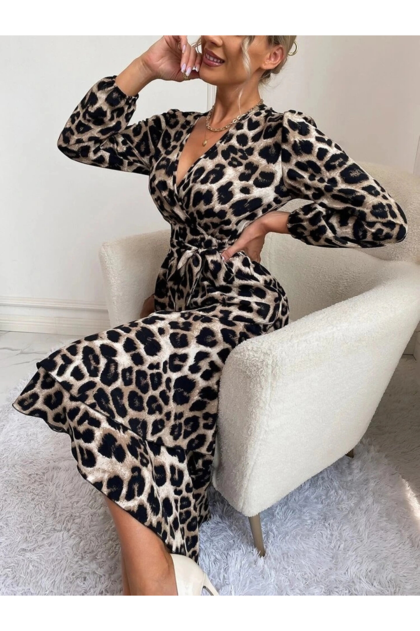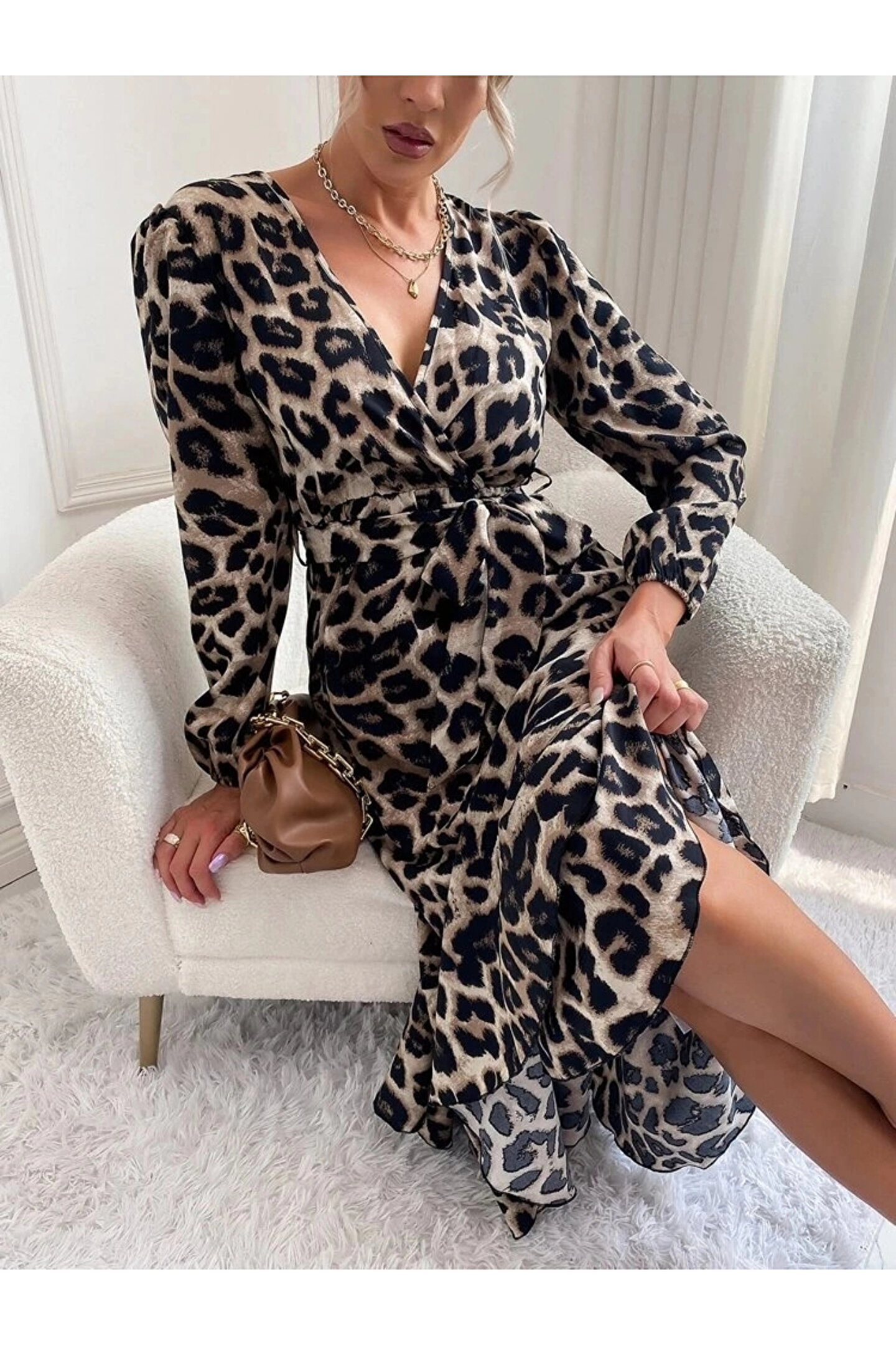 Kadın Uzun Kollu Kruvaze Yakalı Belden Kuşaklı Leopar