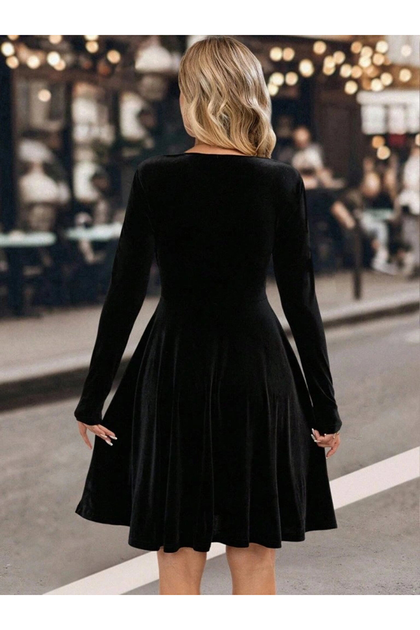Kadın Uzun Kollu Kruvaze Yakalı Toka Detaylı Mini Kadife Elbise