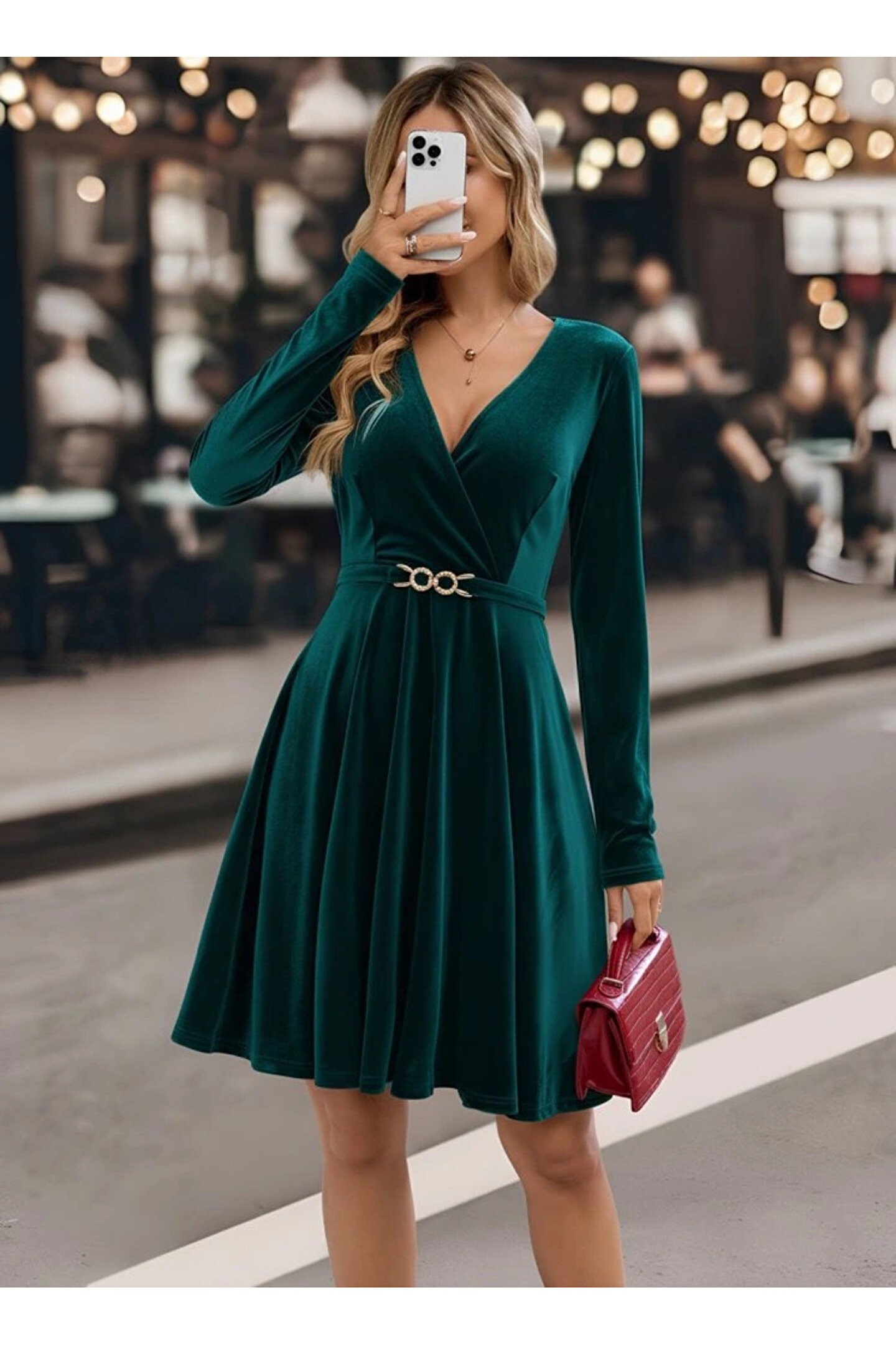 Silerra Kadın Uzun Kollu Kruvaze Yakalı Toka Detaylı Mini Kadife Elbise