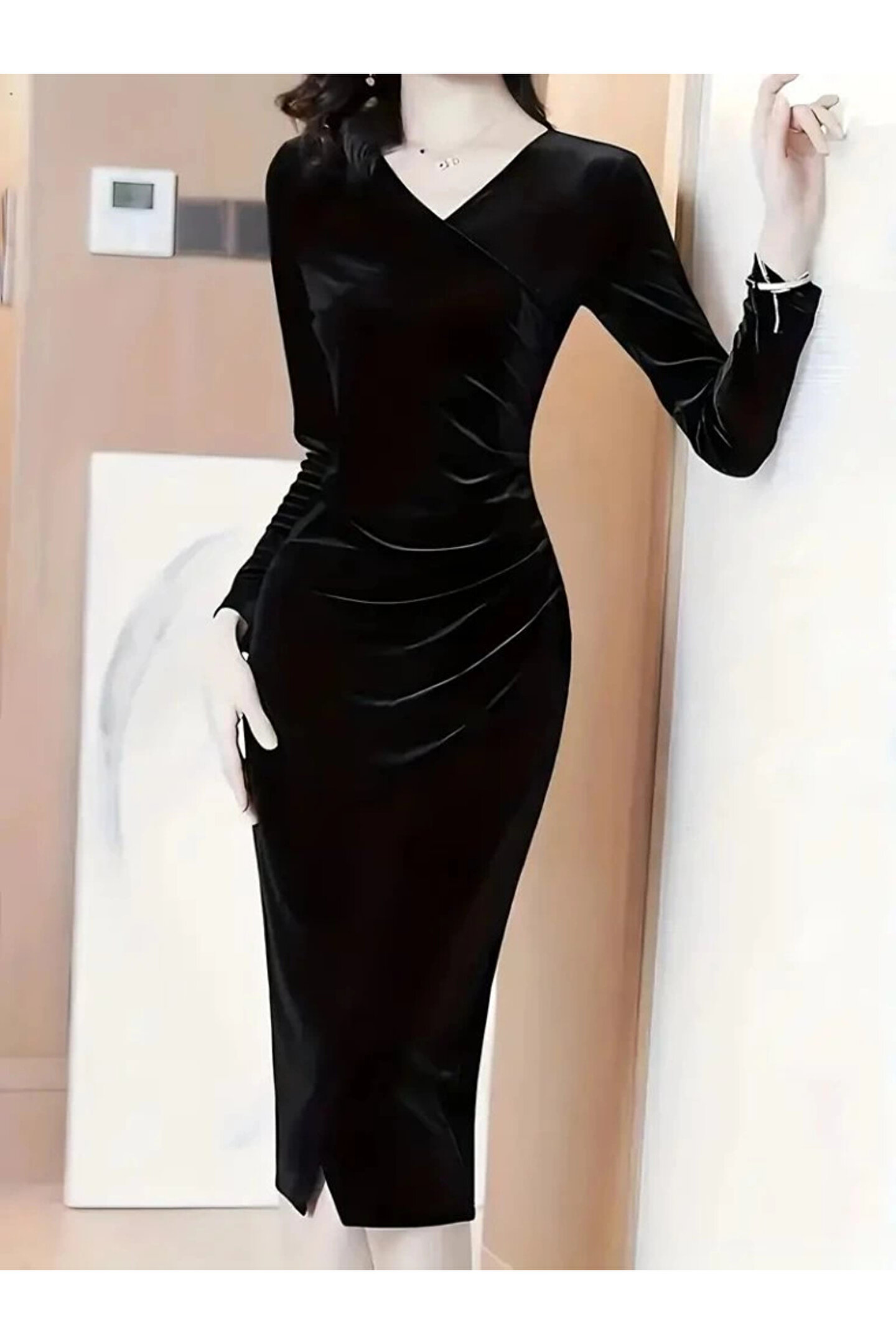 Kadın Uzun Kollu Kruvaze Yakalı Yandan Büzgülü önden çapraz Detaylı Midi Kadife Elbise