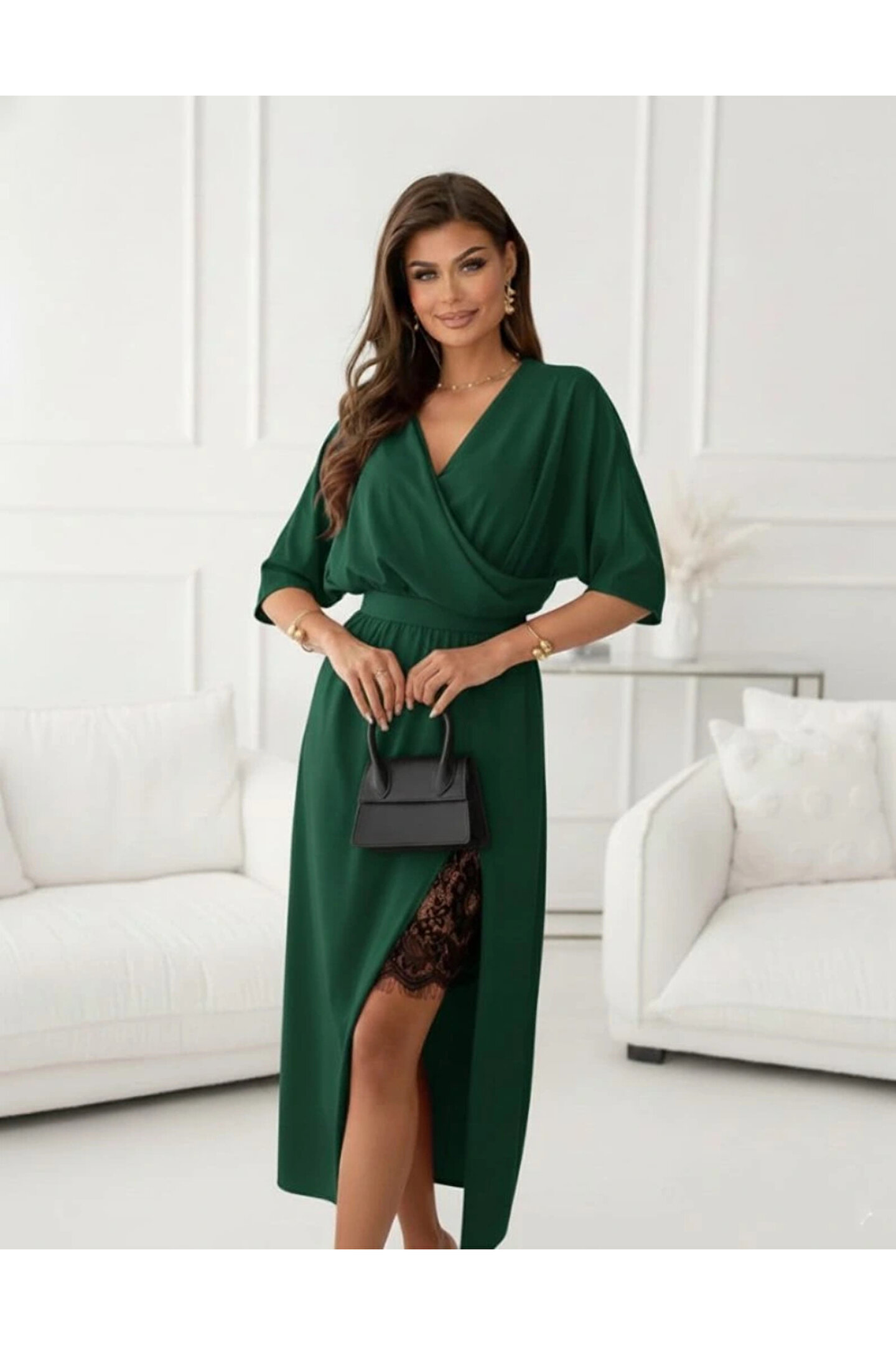 Kadın Uzun Kollu Kruvaze Yakalı Yandan Dantelli Midi Ithal Krep Elbise
