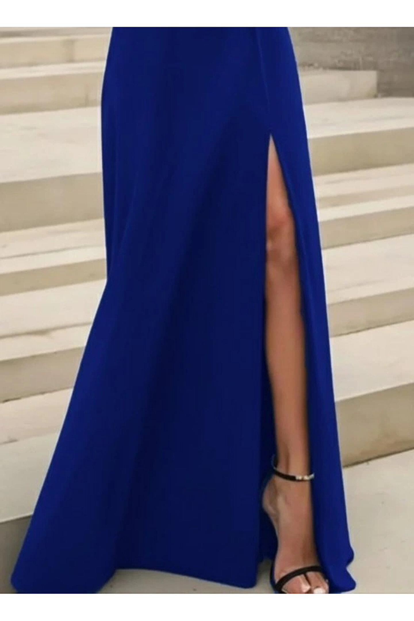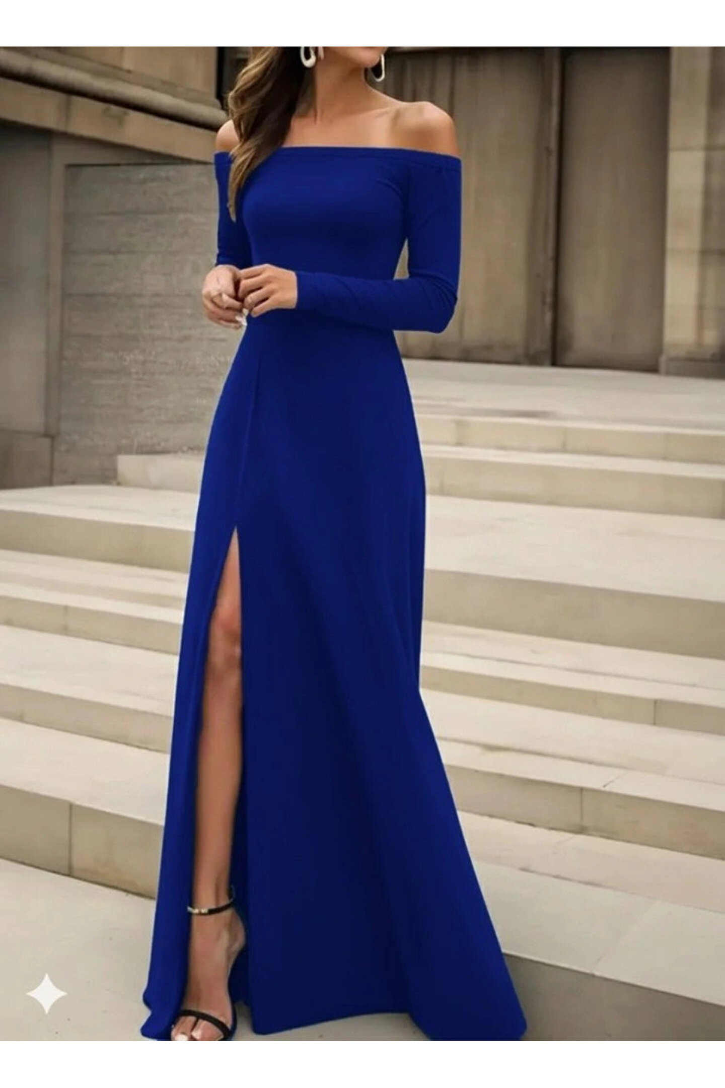 Kadın Uzun Kollu Madonna Yakalı Yırtmaç Detaylı Uzun Ithal Krep Elbise