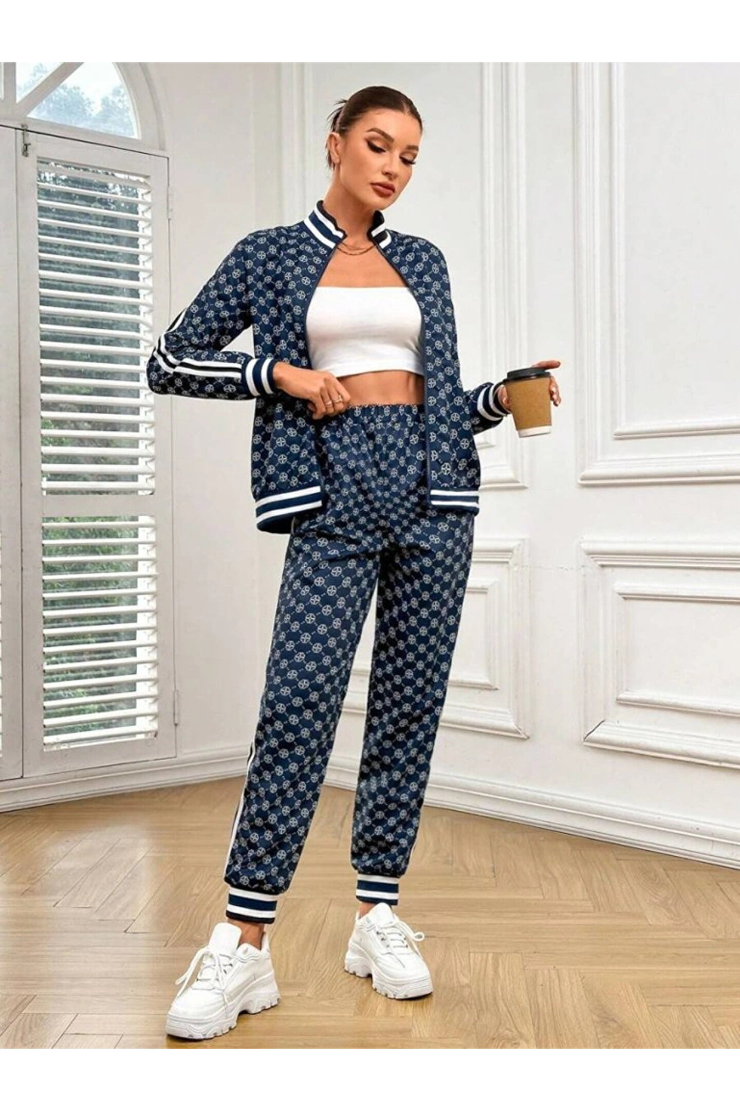 Kadın Uzun Kollu önden Fermuarlı Desenli Iki Iplik Bluz Ve Pantolon Ikili Takım