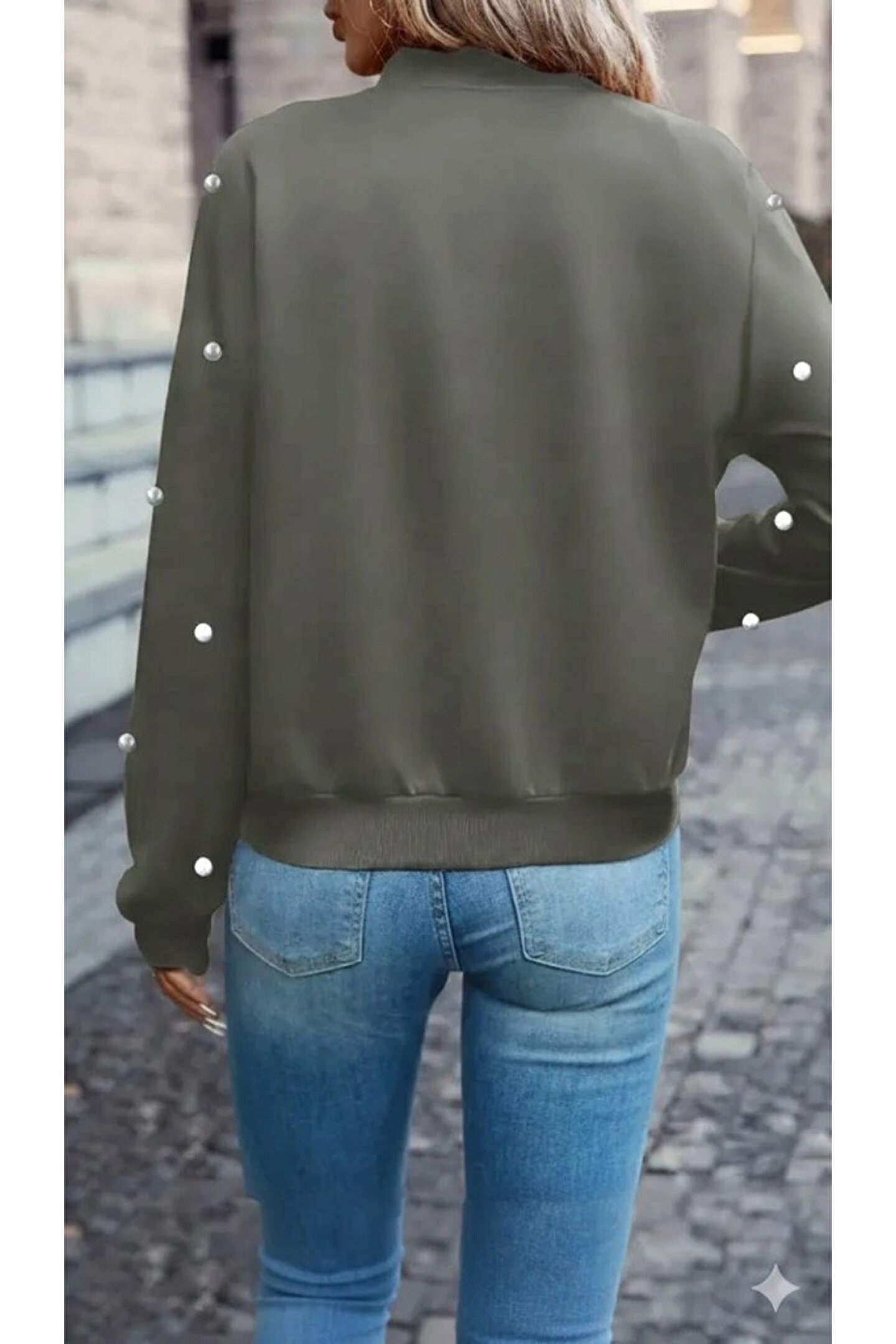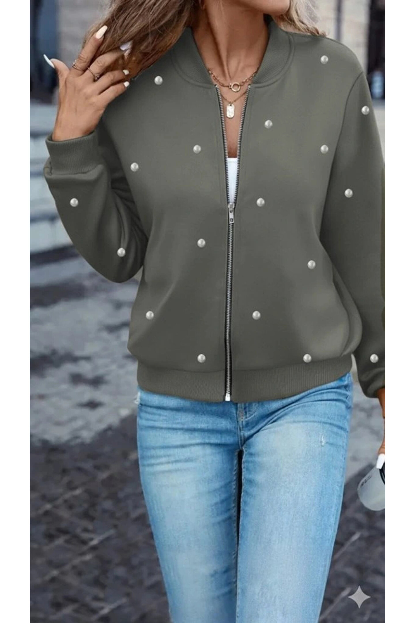 Kadın Uzun Kollu önden Fermuarlı Incili Kısa Modal Ceket