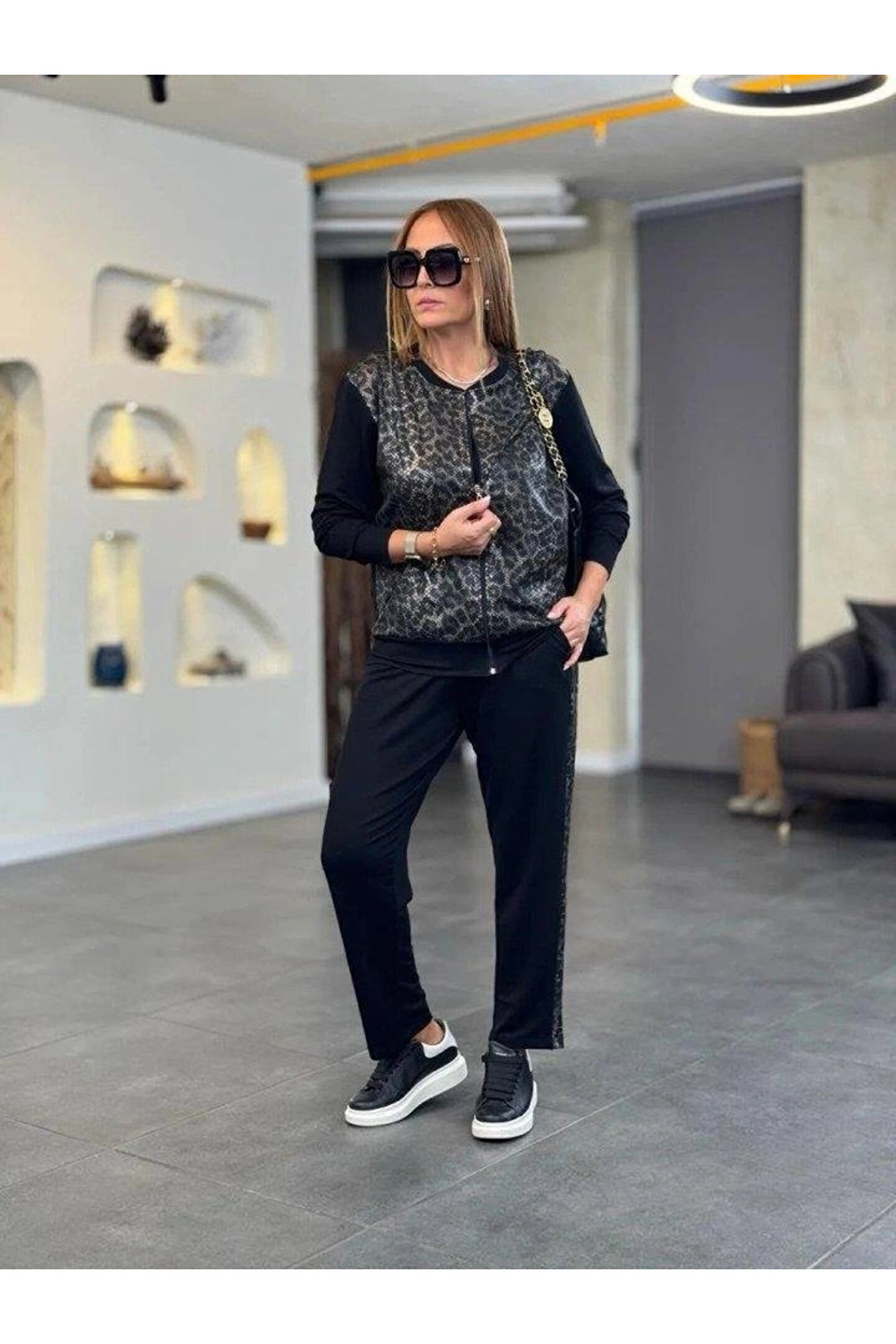 Kadın Uzun Kollu önden Fermuarlı Leopar Desenli Viskon Iki Iplik Bluz Ve Pantolon Ikili Takım