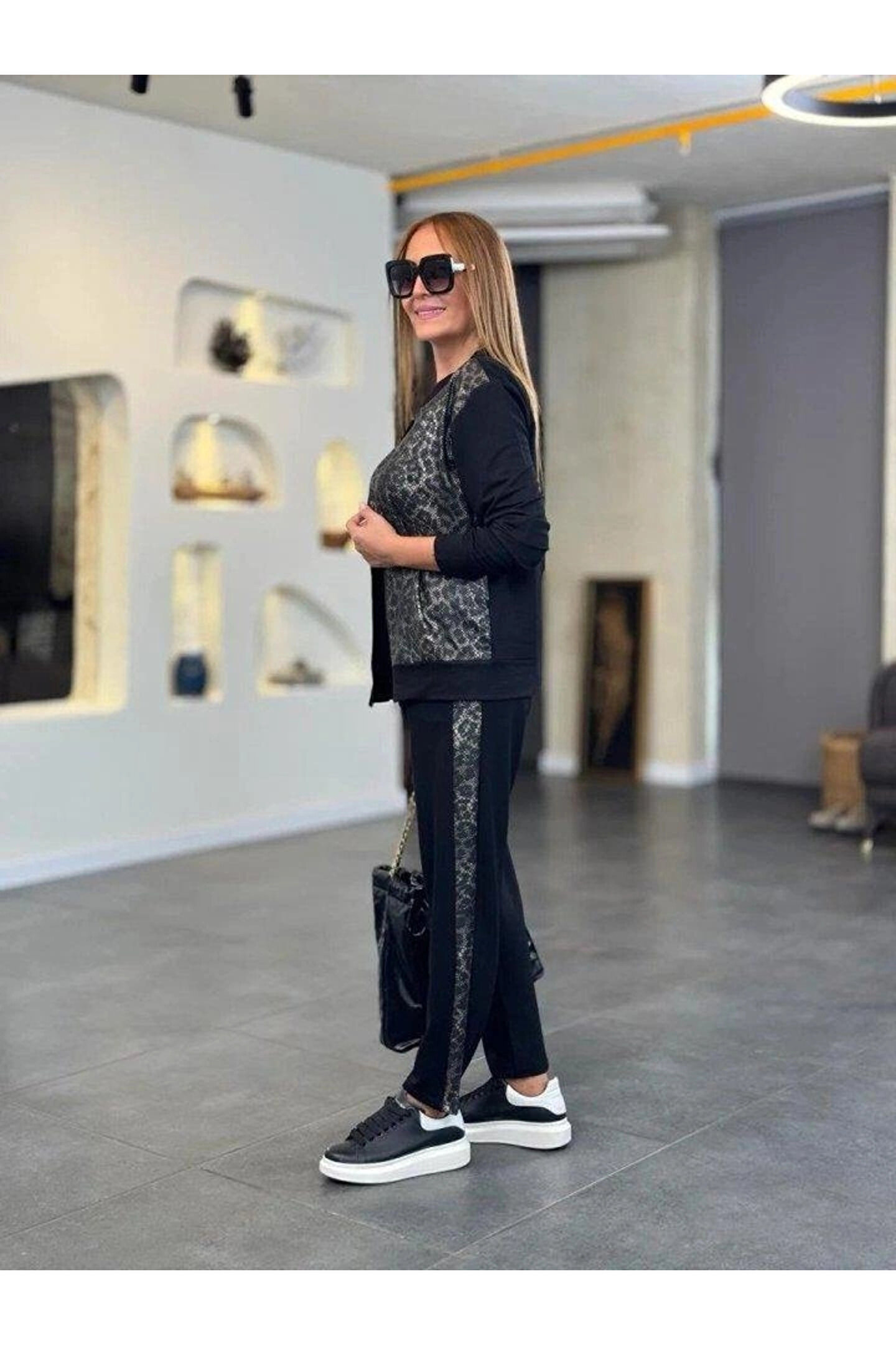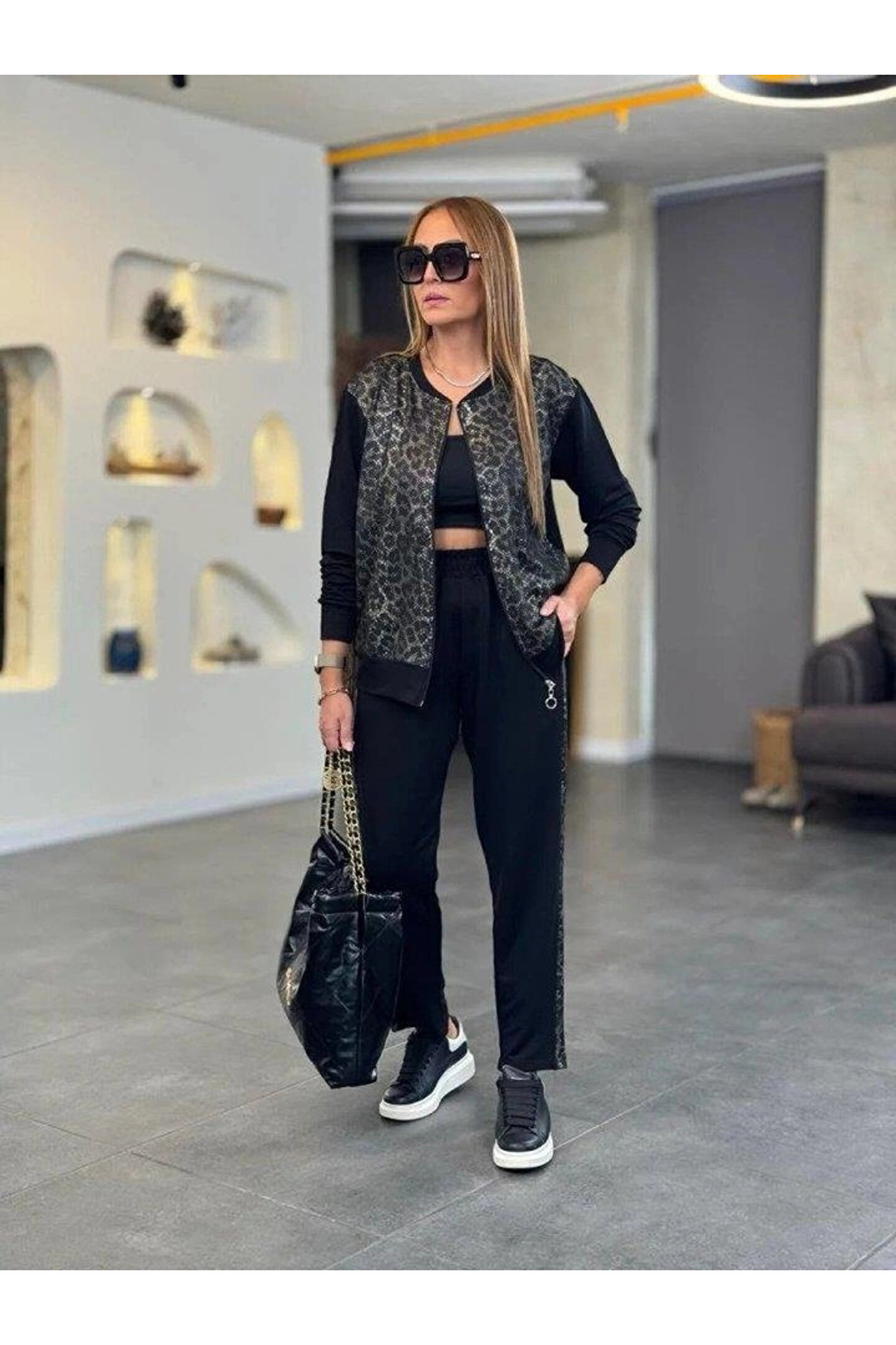 Kadın Uzun Kollu önden Fermuarlı Leopar Desenli Viskon Iki Iplik Bluz Ve Pantolon Ikili Takım
