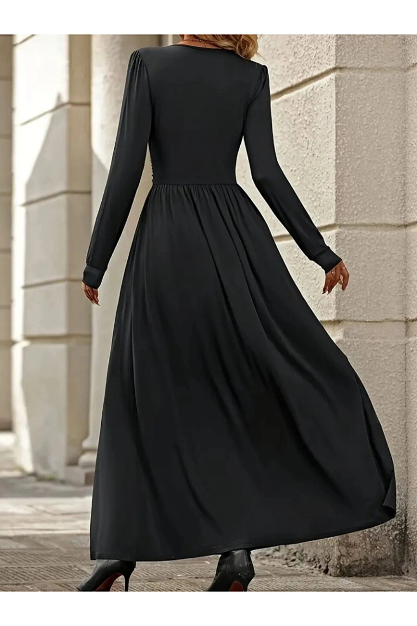 Kadın Uzun Kollu V Dantel Yakalı Yırtmaçlı Uzun Sandy Elbise
