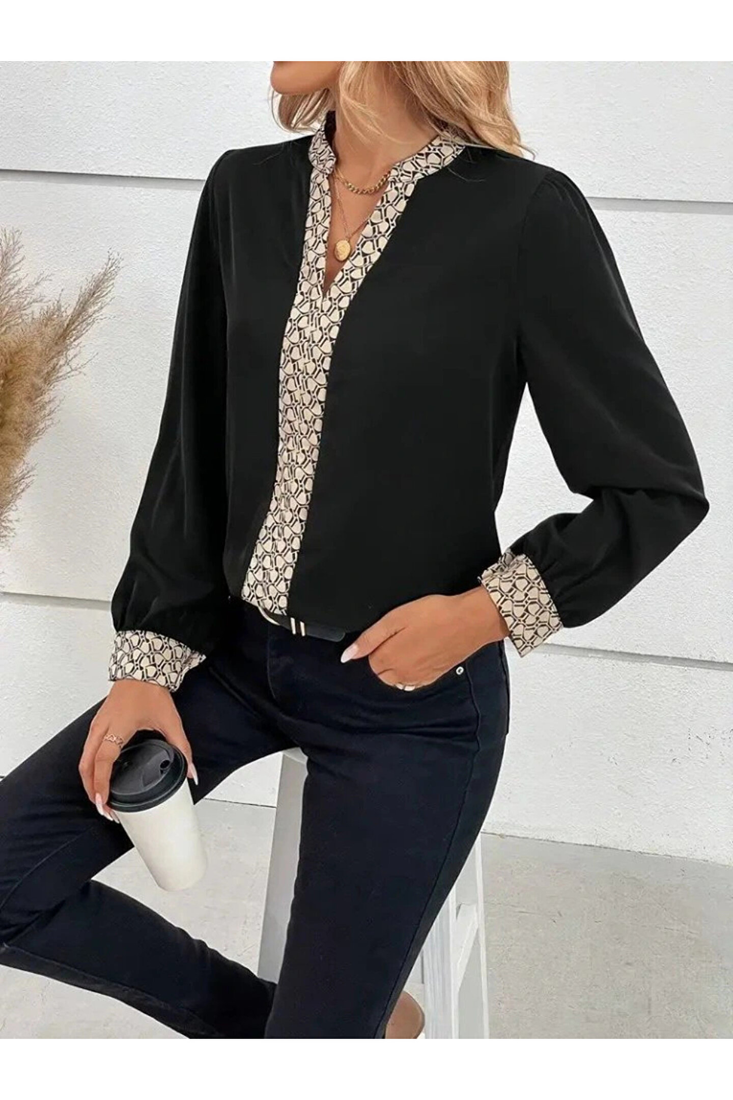 Kadın Uzun Kollu V Hakim Yakalı Desenli Ithal Krep Bluz