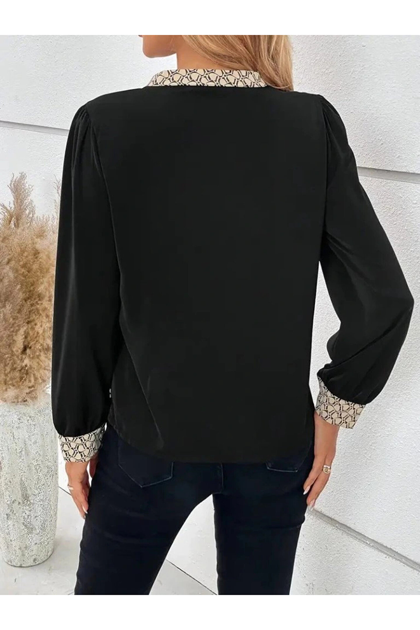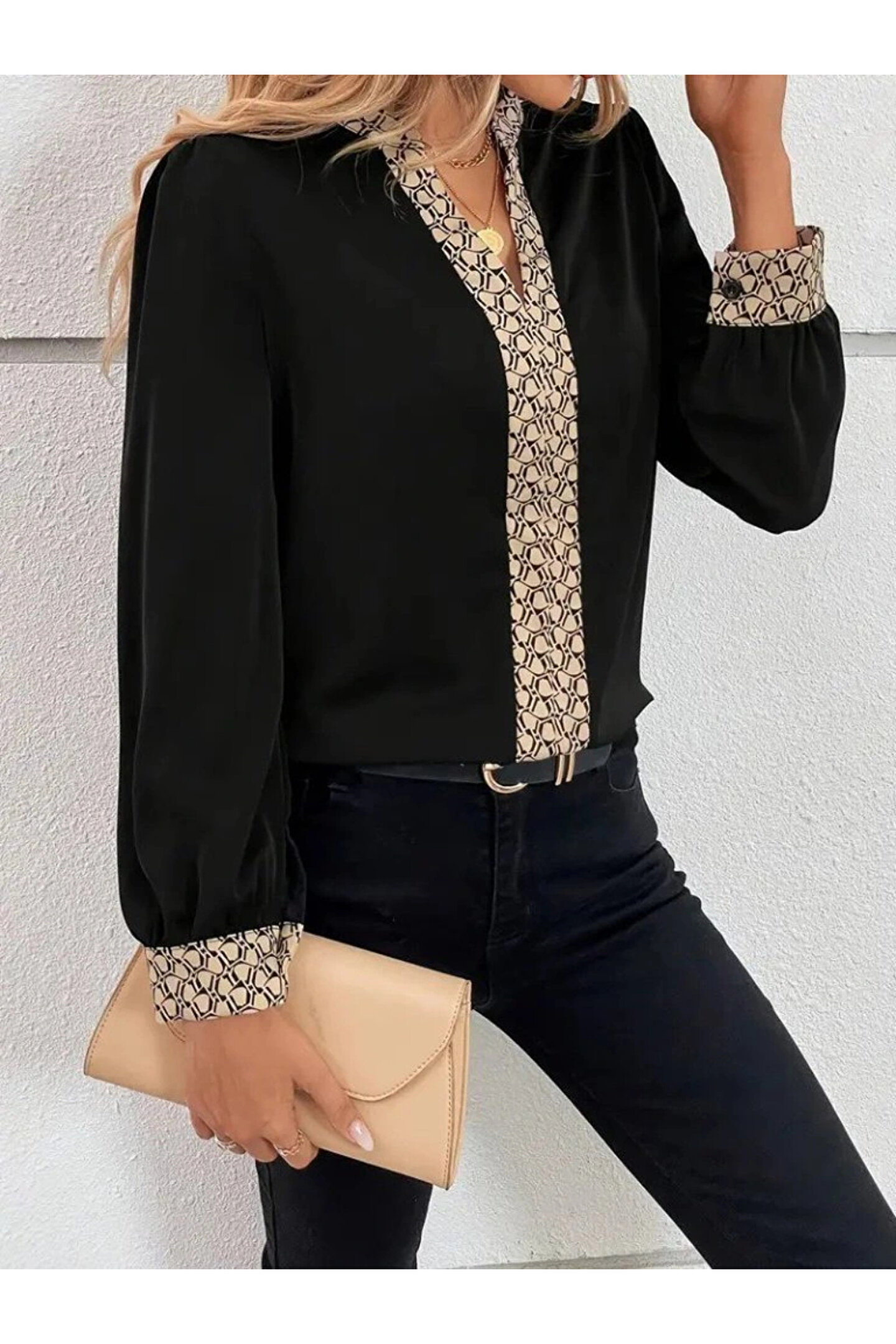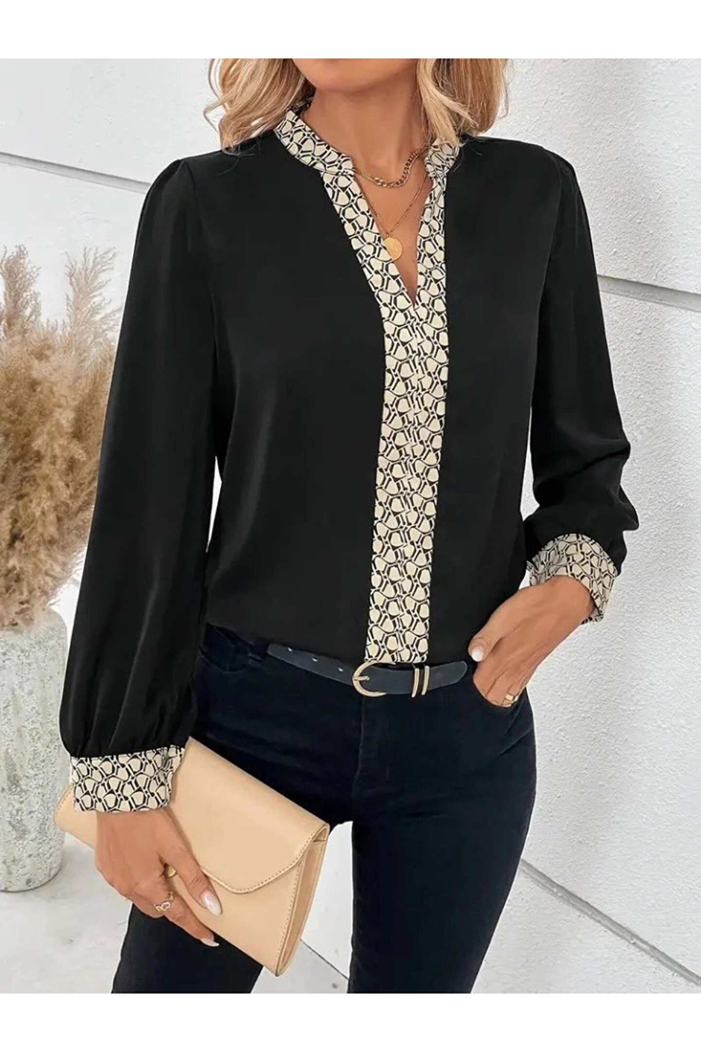 Kadın Uzun Kollu V Hakim Yakalı Desenli Ithal Krep Bluz