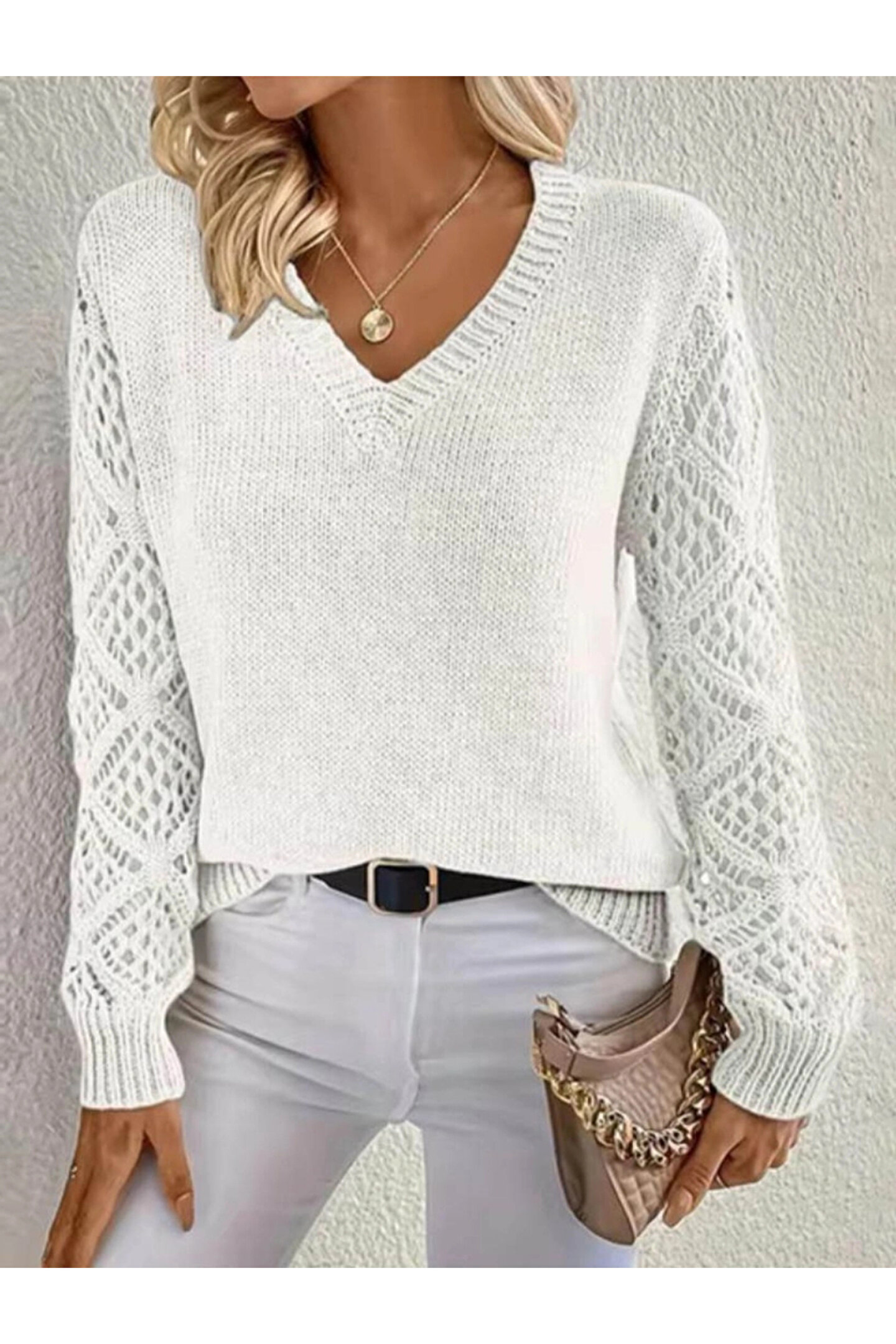 Kadın Uzun Kollu V Yaka Kol Delikli Baklava Desen Detaylı Triko Kazak