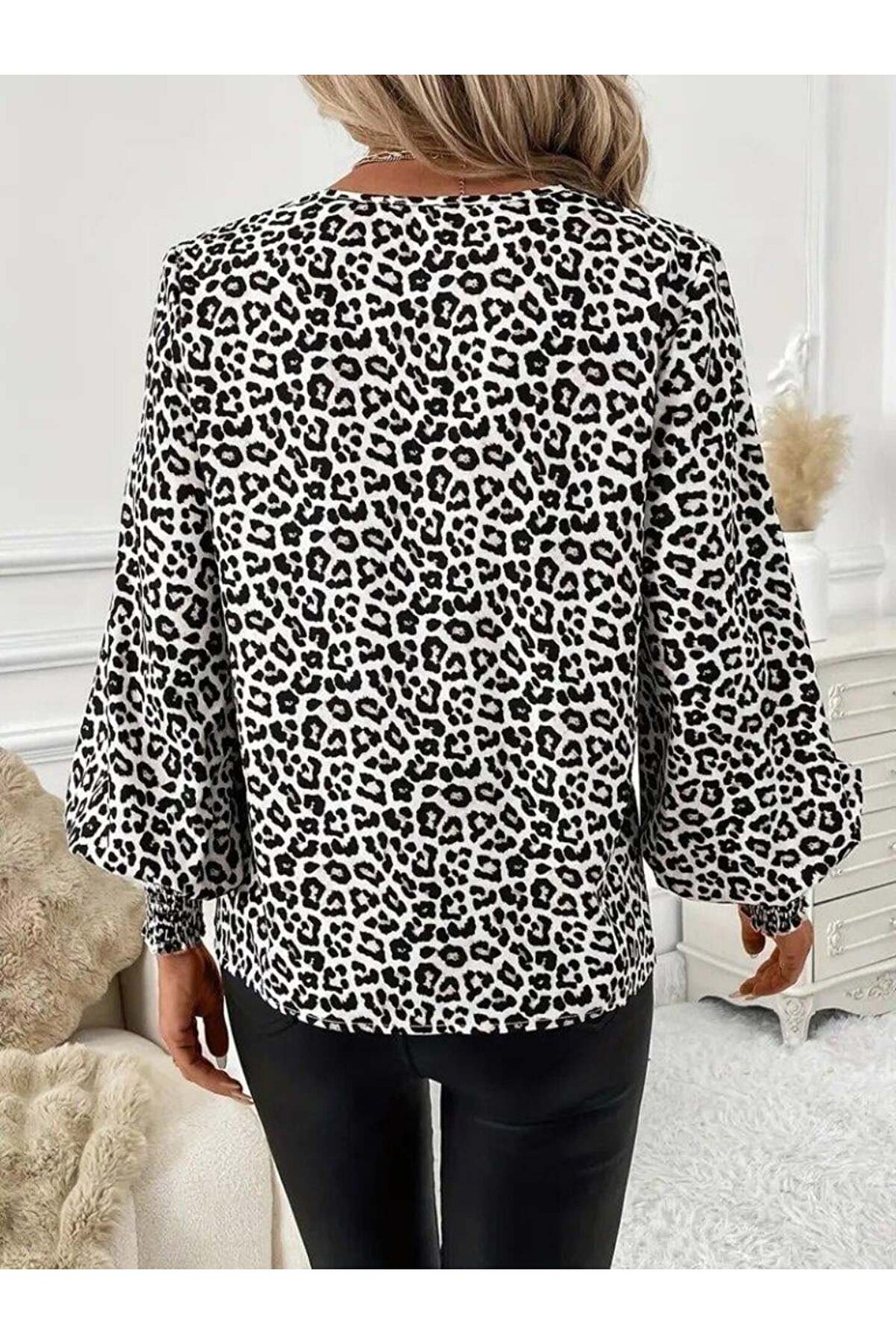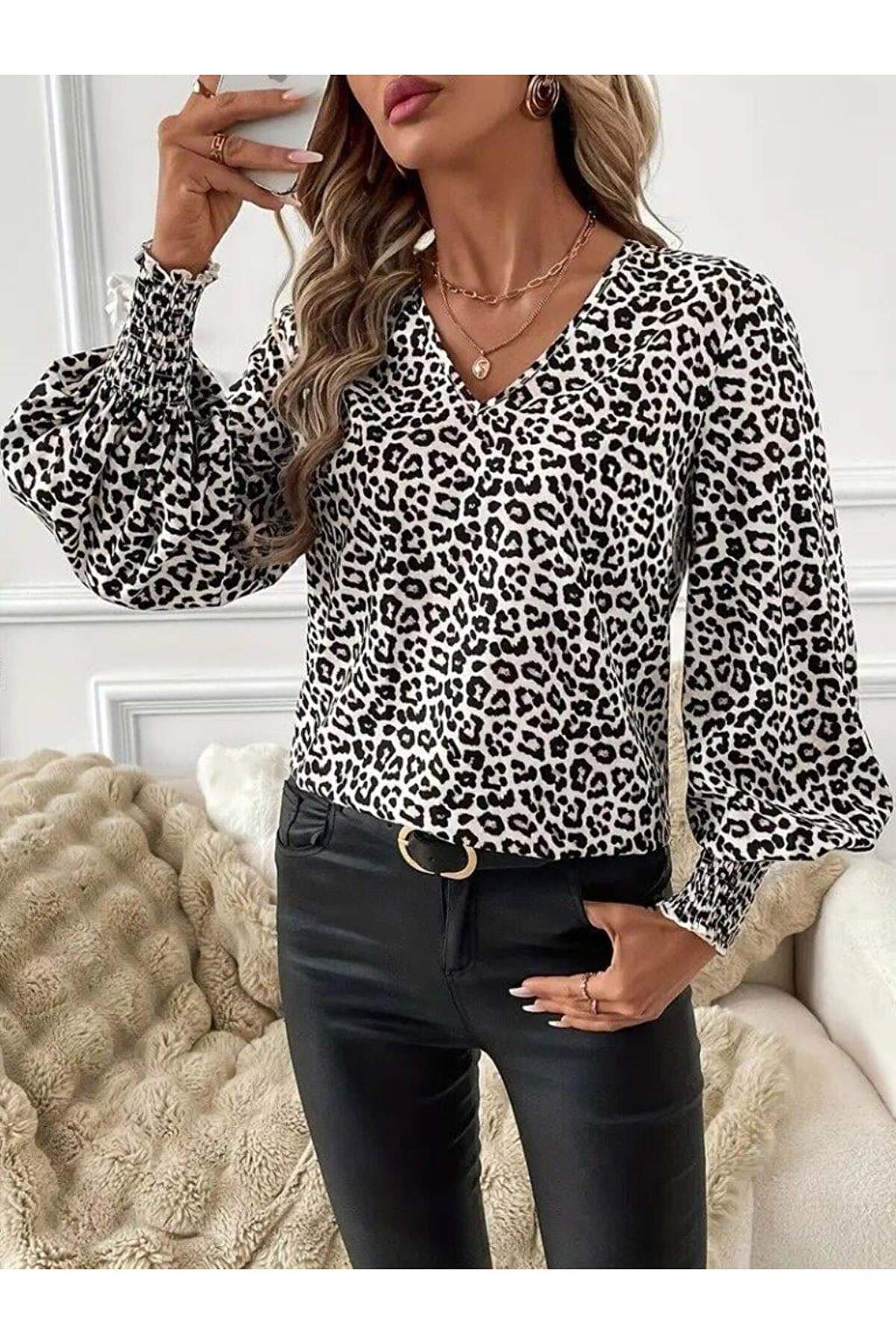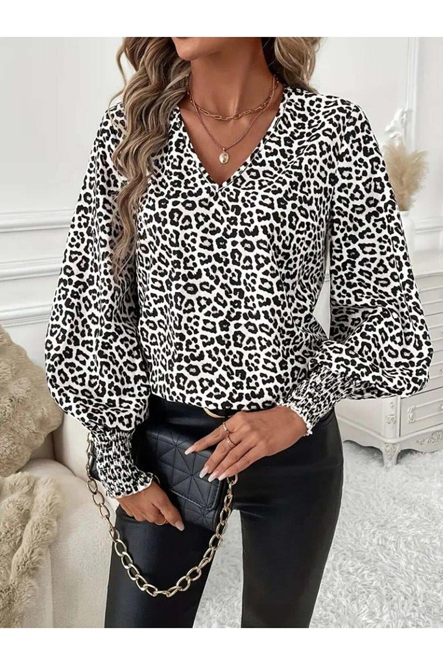Kadın Uzun Kollu V Yaka Kollar Gipe Detaylı Leopar Desenli Süprem Bluz