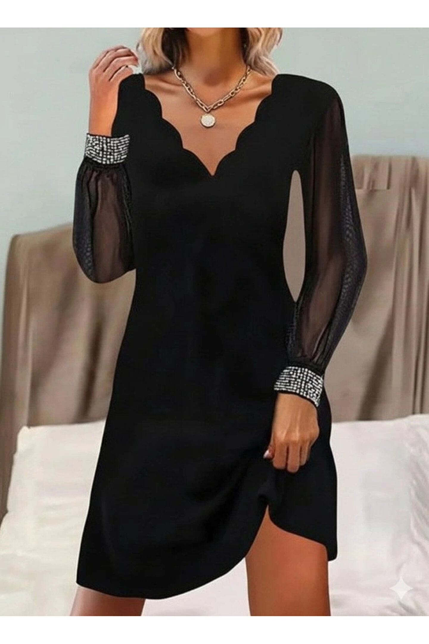 Kadın Uzun Kollu V Yaka Lazer Kesimli Tül Detaylı Mini Ithal Krep Elbise