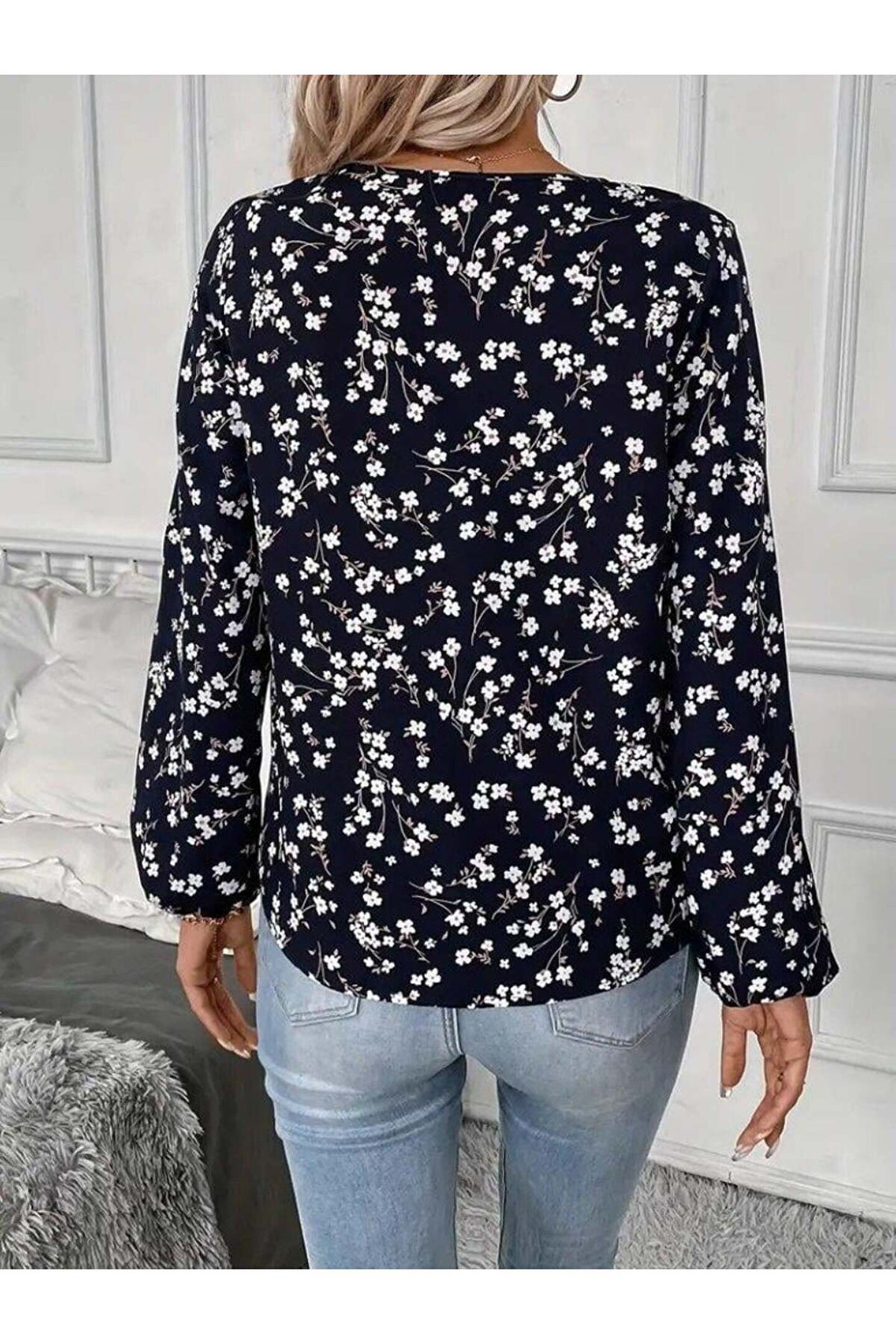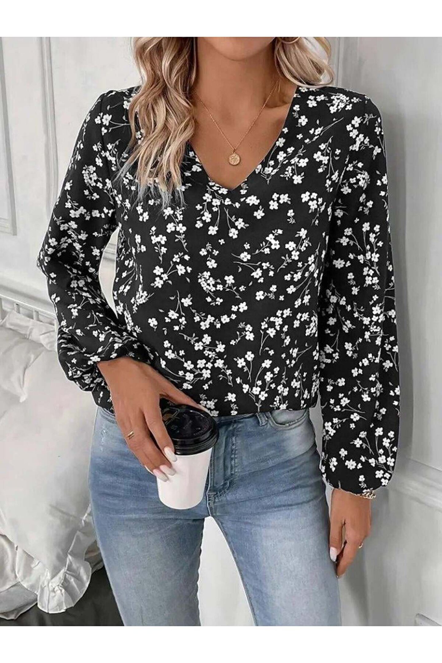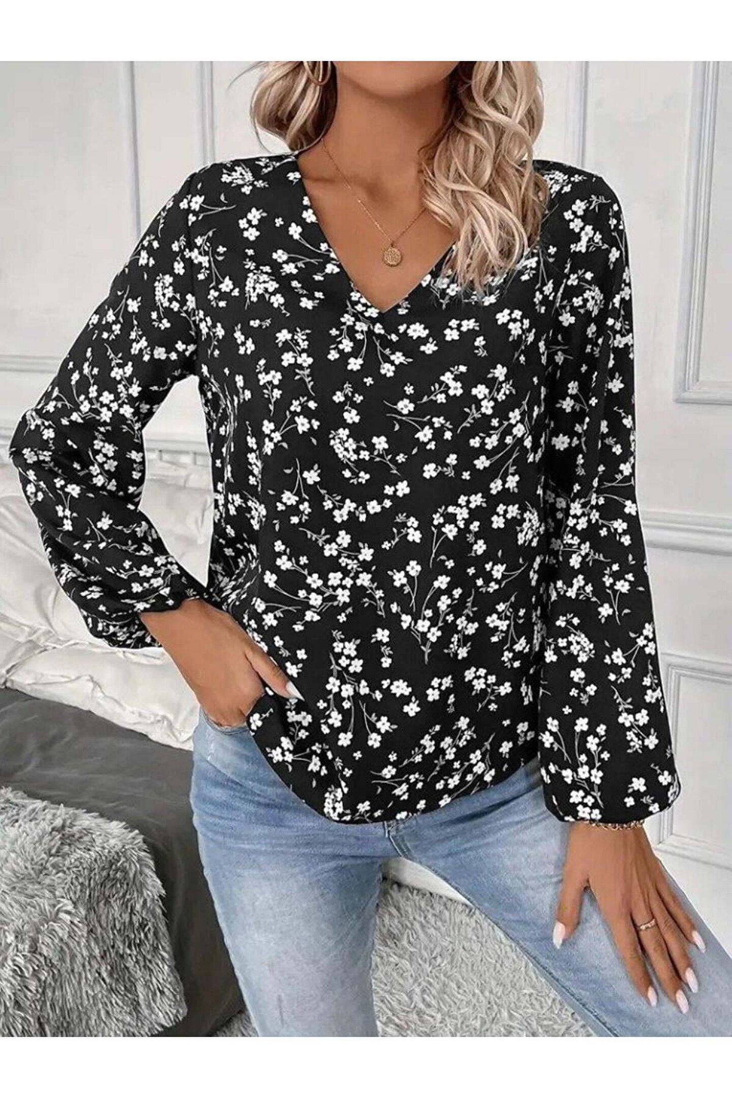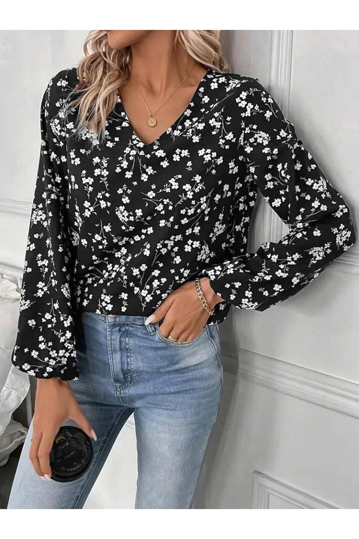 Kadın Uzun Kollu V Yakalı çiçek Desenli Modal Bluz