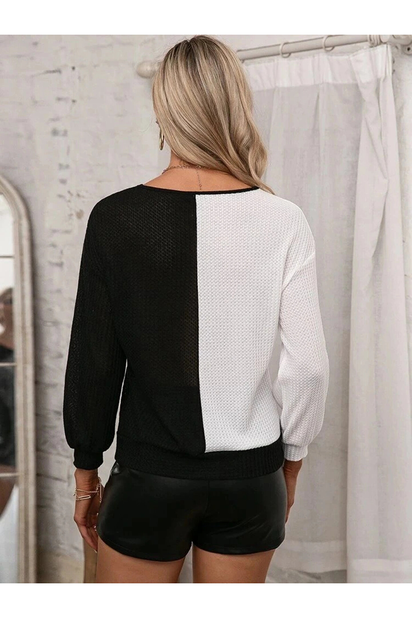Kadın Uzun Kollu V Yakalı çift Renkli Triko Bluz