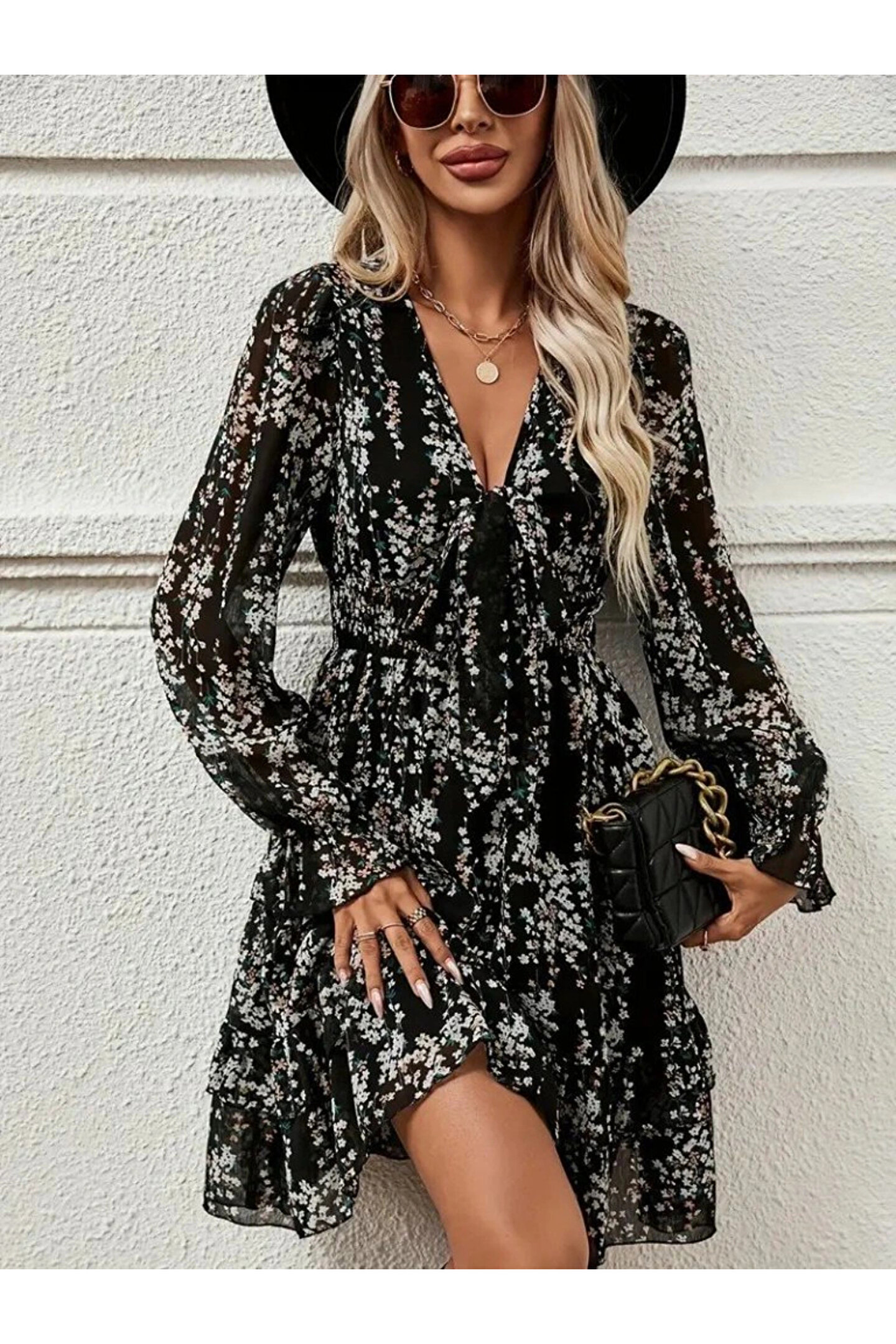 Kadın Uzun Kollu V Yakalı Fırfırlı Ve Bağcıklı şifon Mini Elbise