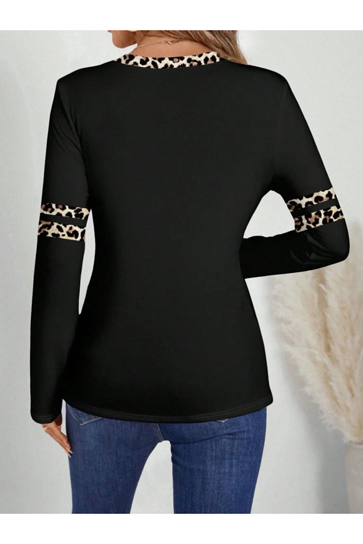 Kadın Uzun Kollu V Yakalı Leopar Desenli Viskon Iki Iplik Bluz