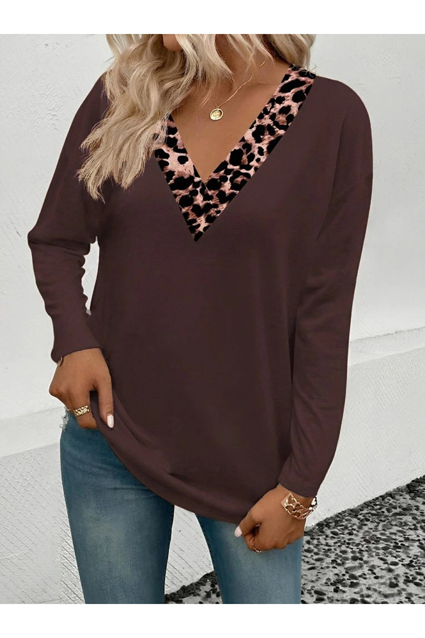 Kadın Uzun Kollu V Yakalı Leopar Detaylı Viskon Iki Iplik Bluz