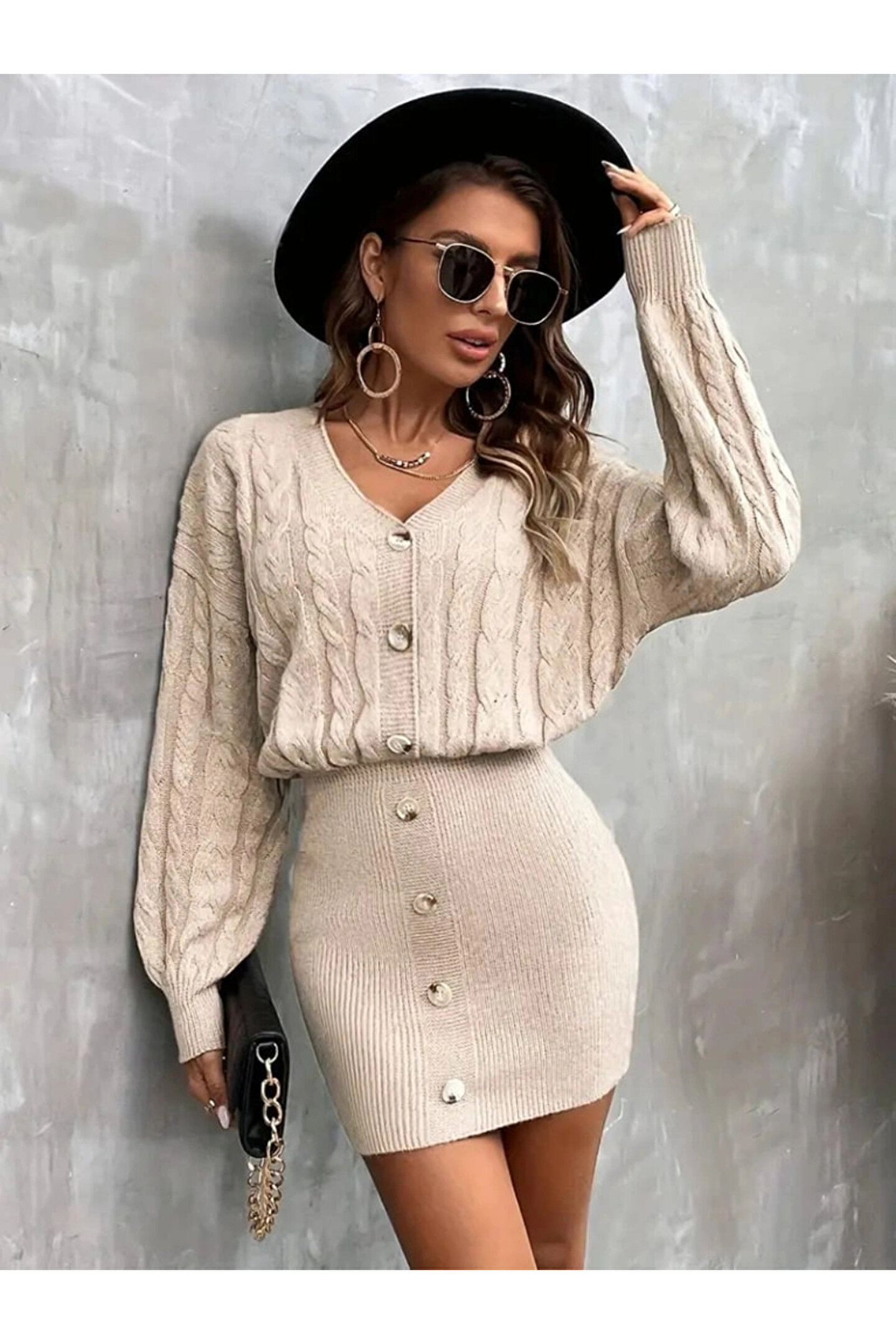 Kadın Uzun Kollu V Yakalı önden Düğmeli Kısa Triko Elbise