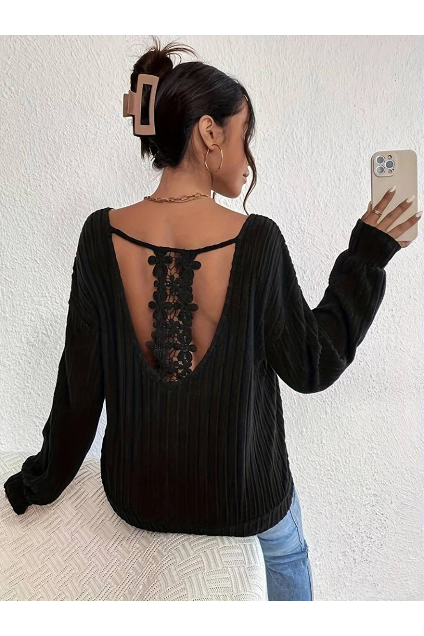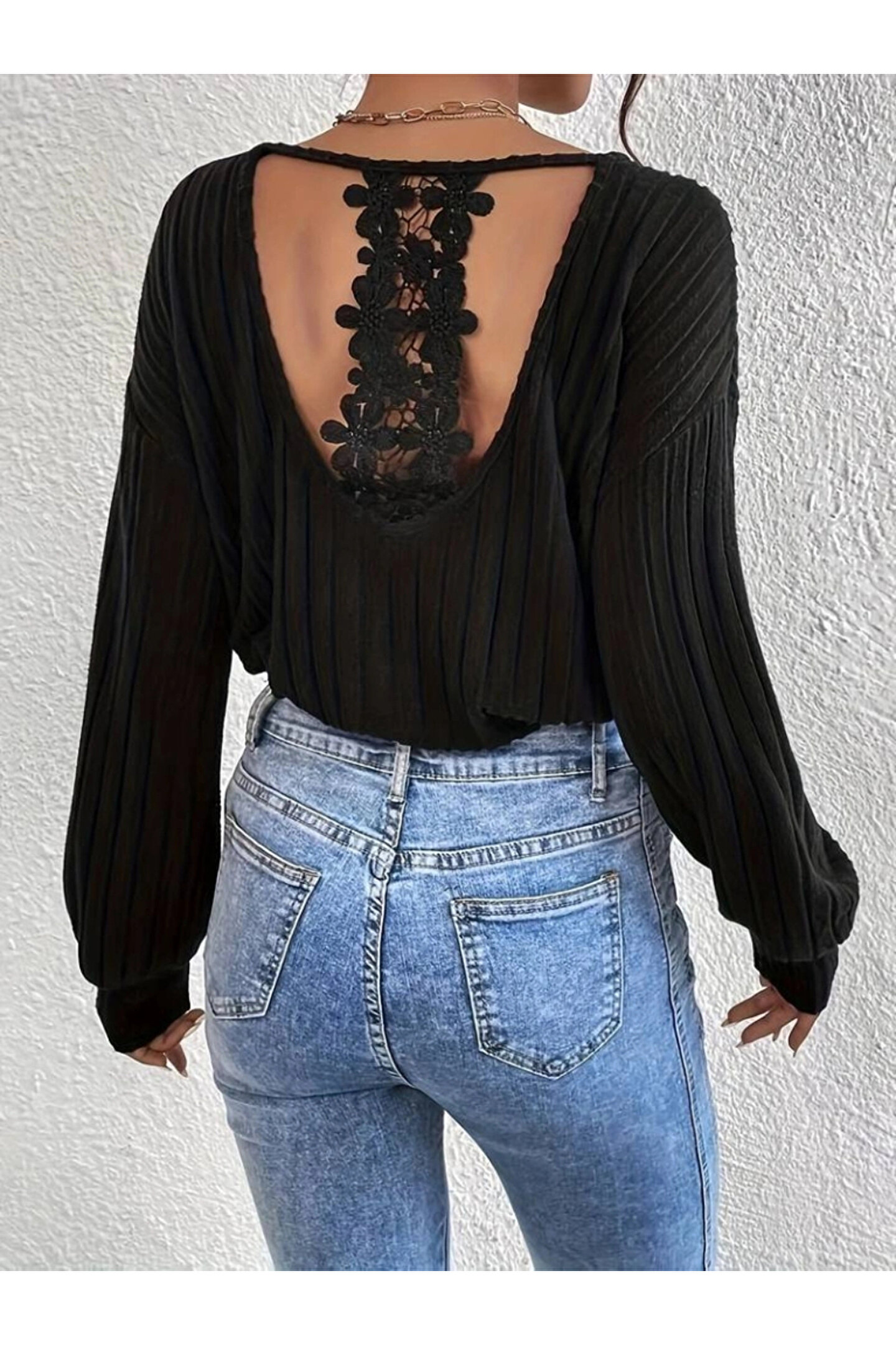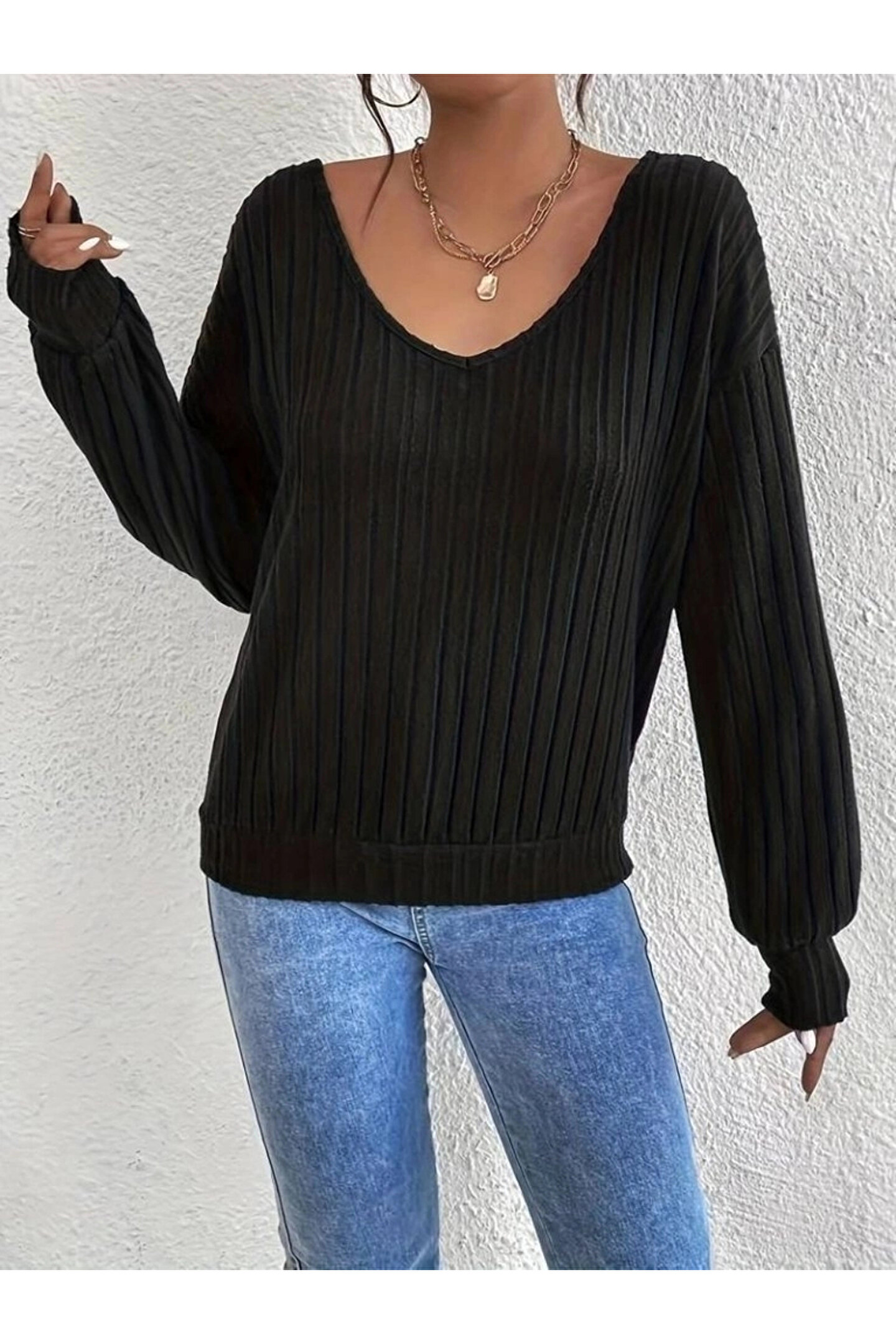 Silerra Kadın Uzun Kollu V Yakalı Pencere Sırt Dantel Detaylı Kalın Fitilli Kaşkorse Bluz