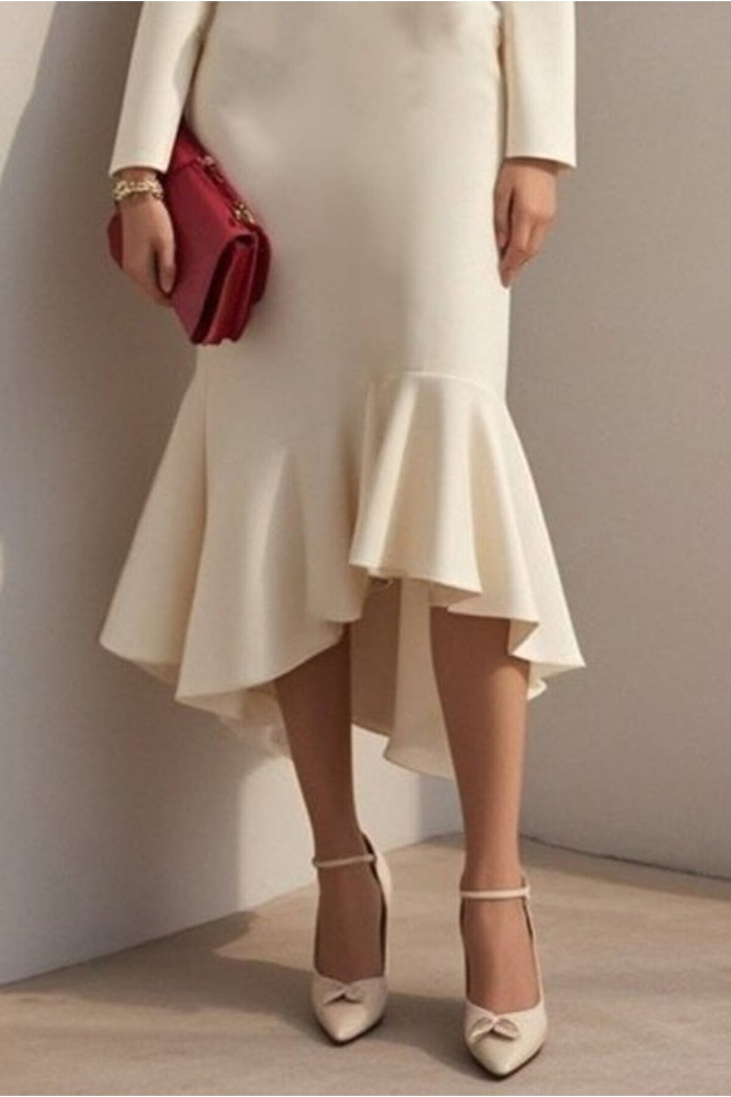 Kadın Uzun Kollu Yakalı Belden Oturtmalı Midi Ithal Krep Elbise