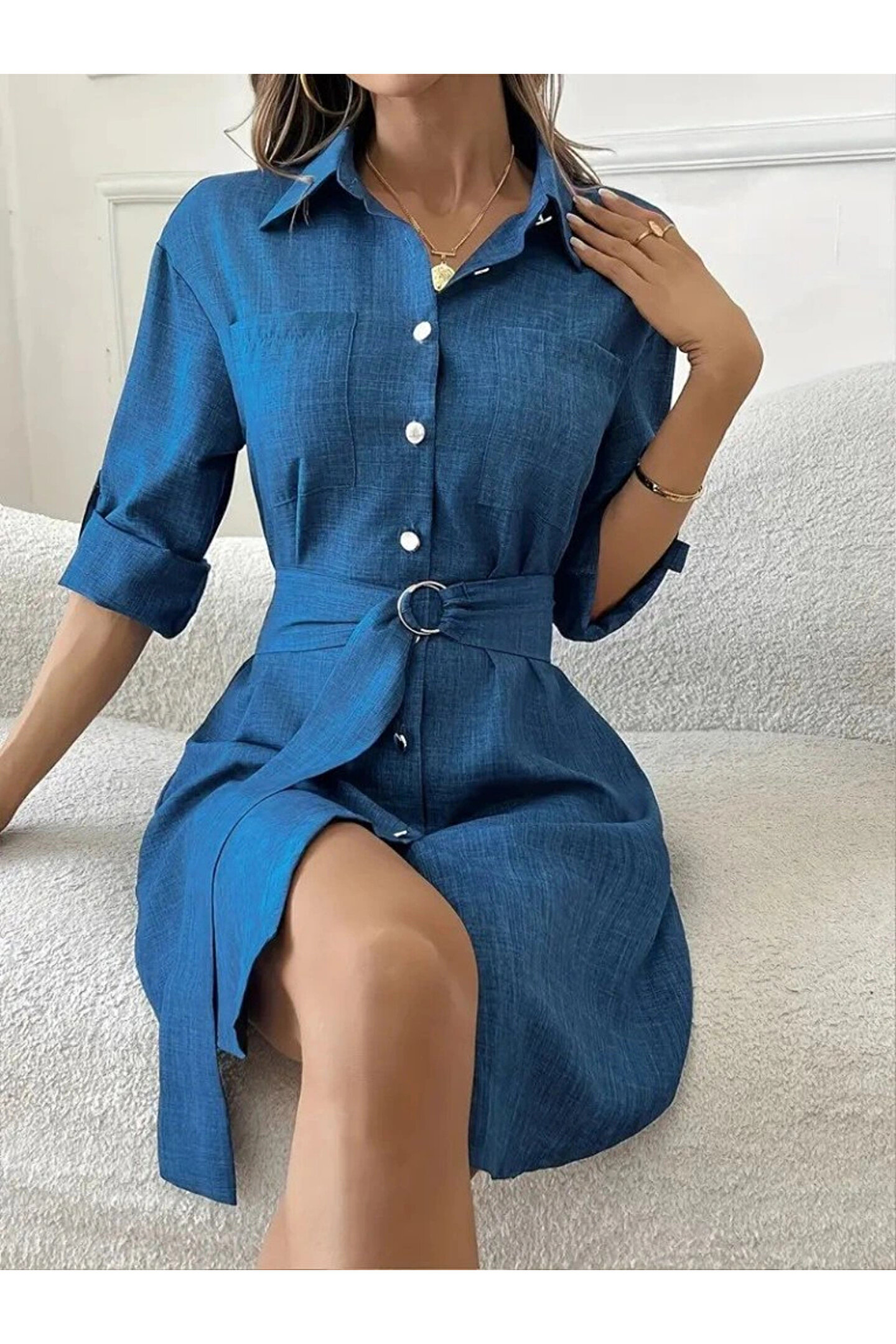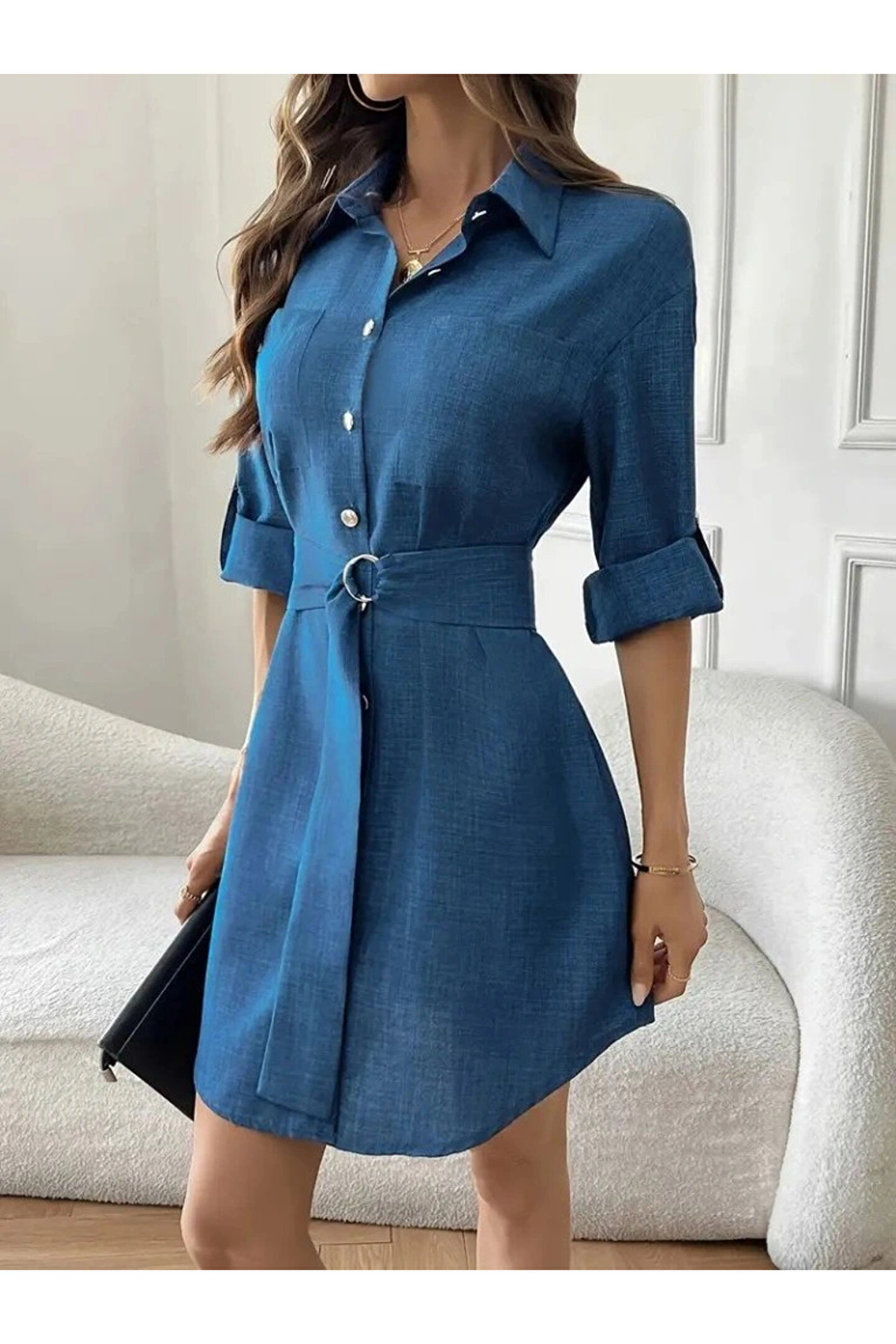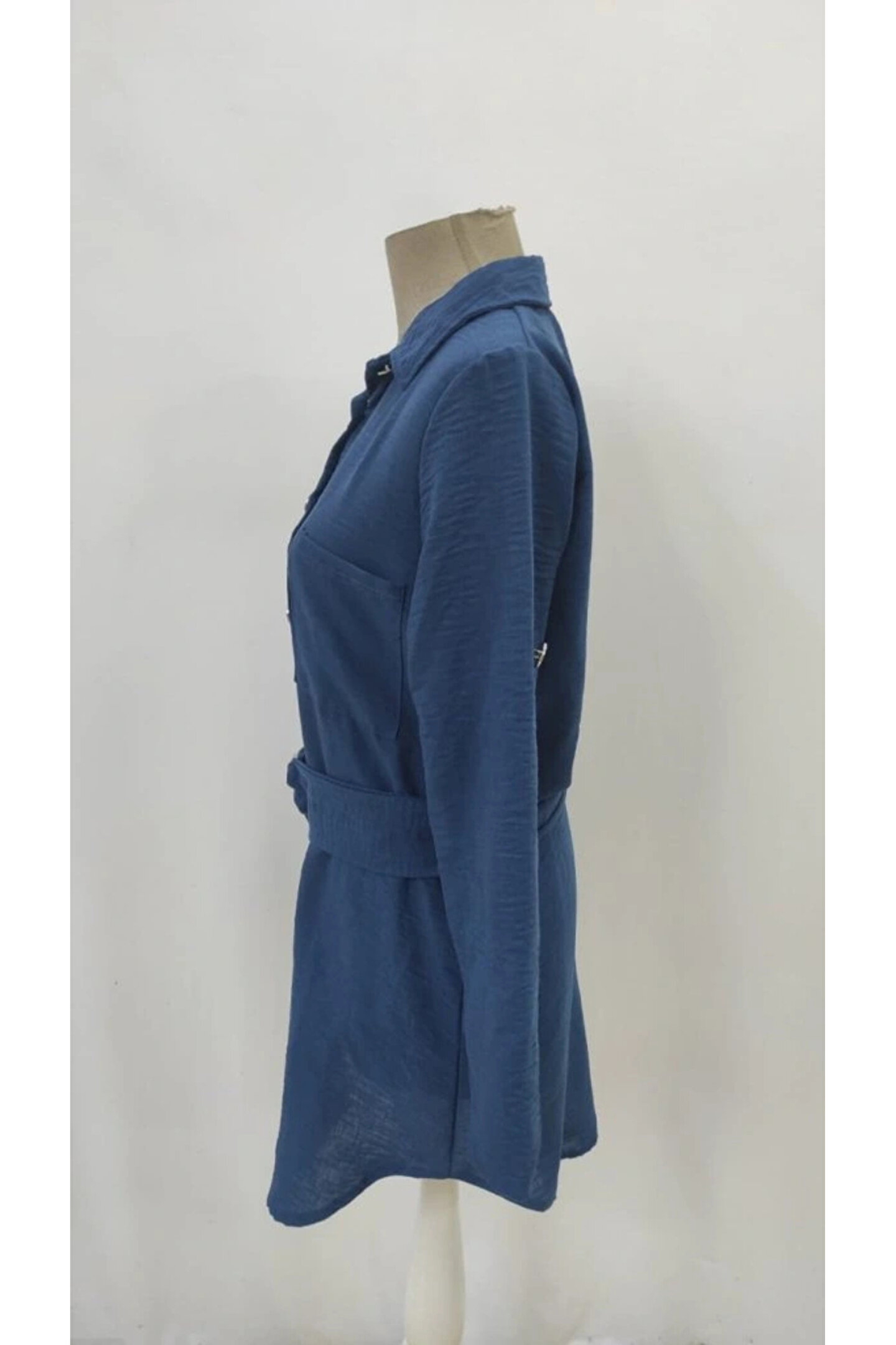 Kadın Uzun Kollu Yakalı önden Düğmeli Beli Kuşaklı Mini Ithal Keten Elbise