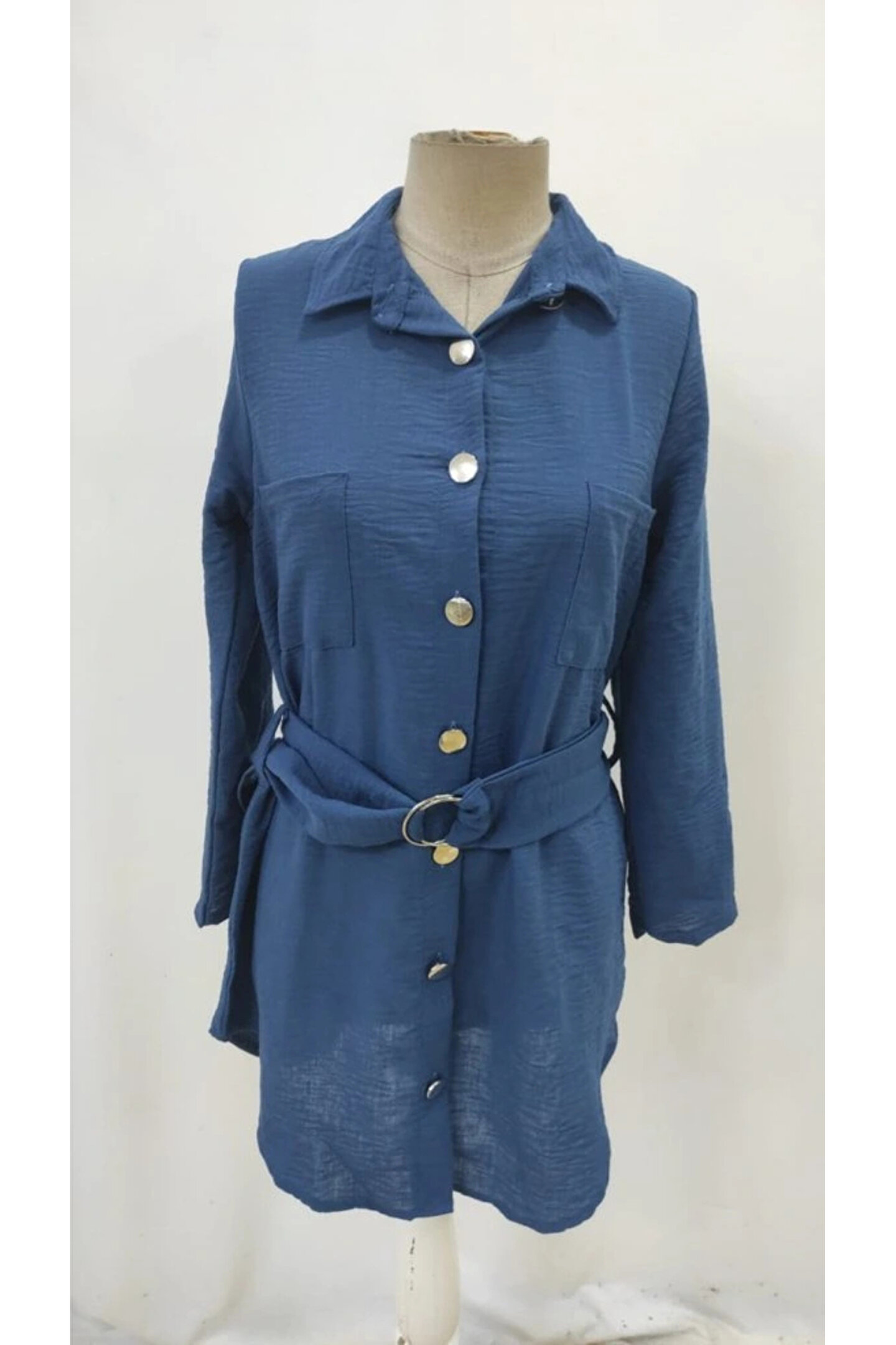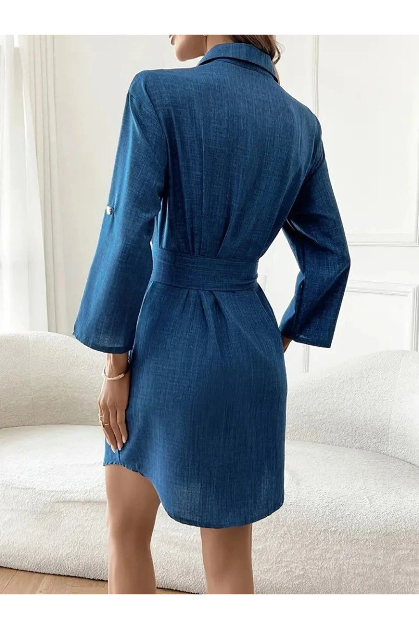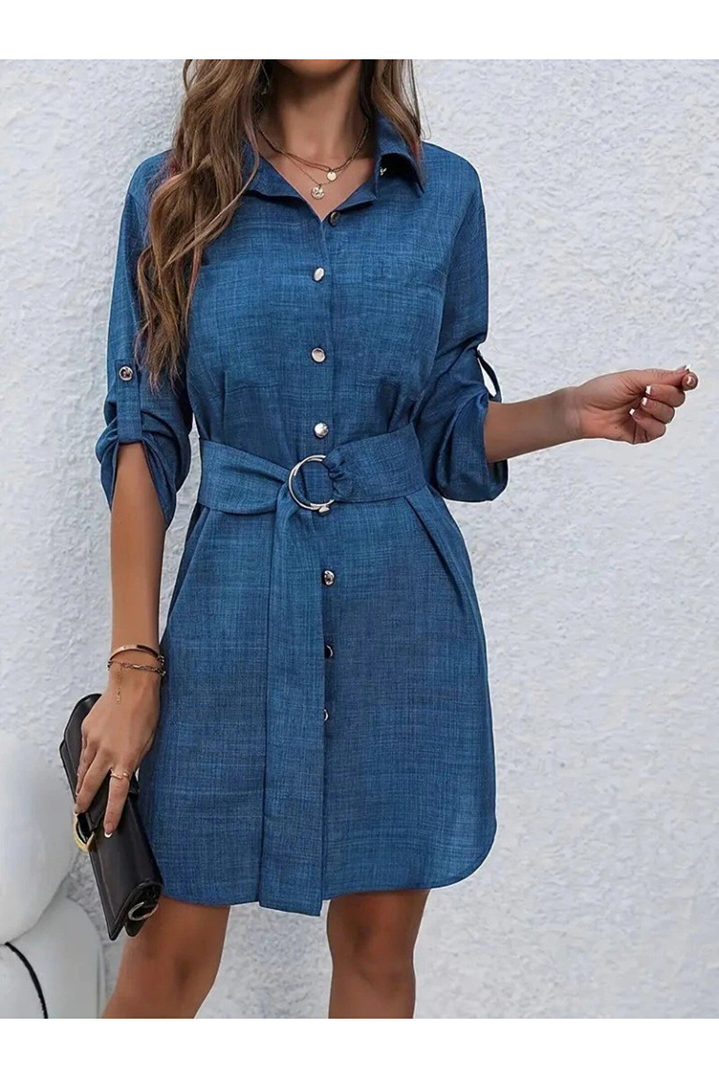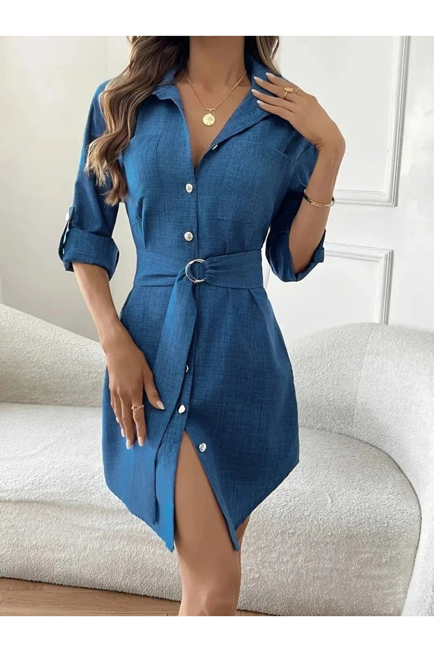 Kadın Uzun Kollu Yakalı önden Düğmeli Beli Kuşaklı Mini Ithal Keten Elbise
