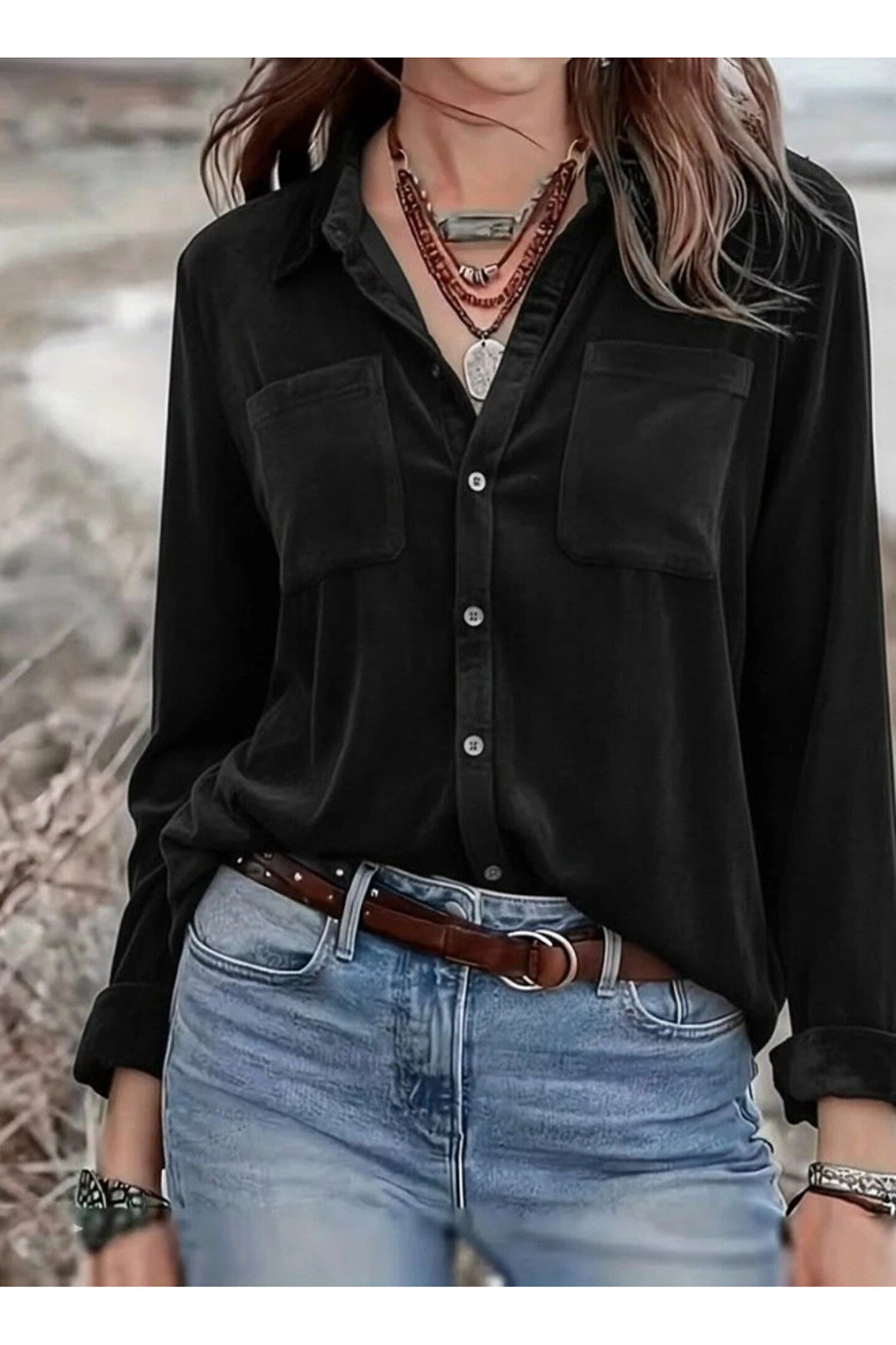 Silerra Kadın Uzun Kollu Yakalı önden Düğmeli Cep Detaylı Kadife Gömlek