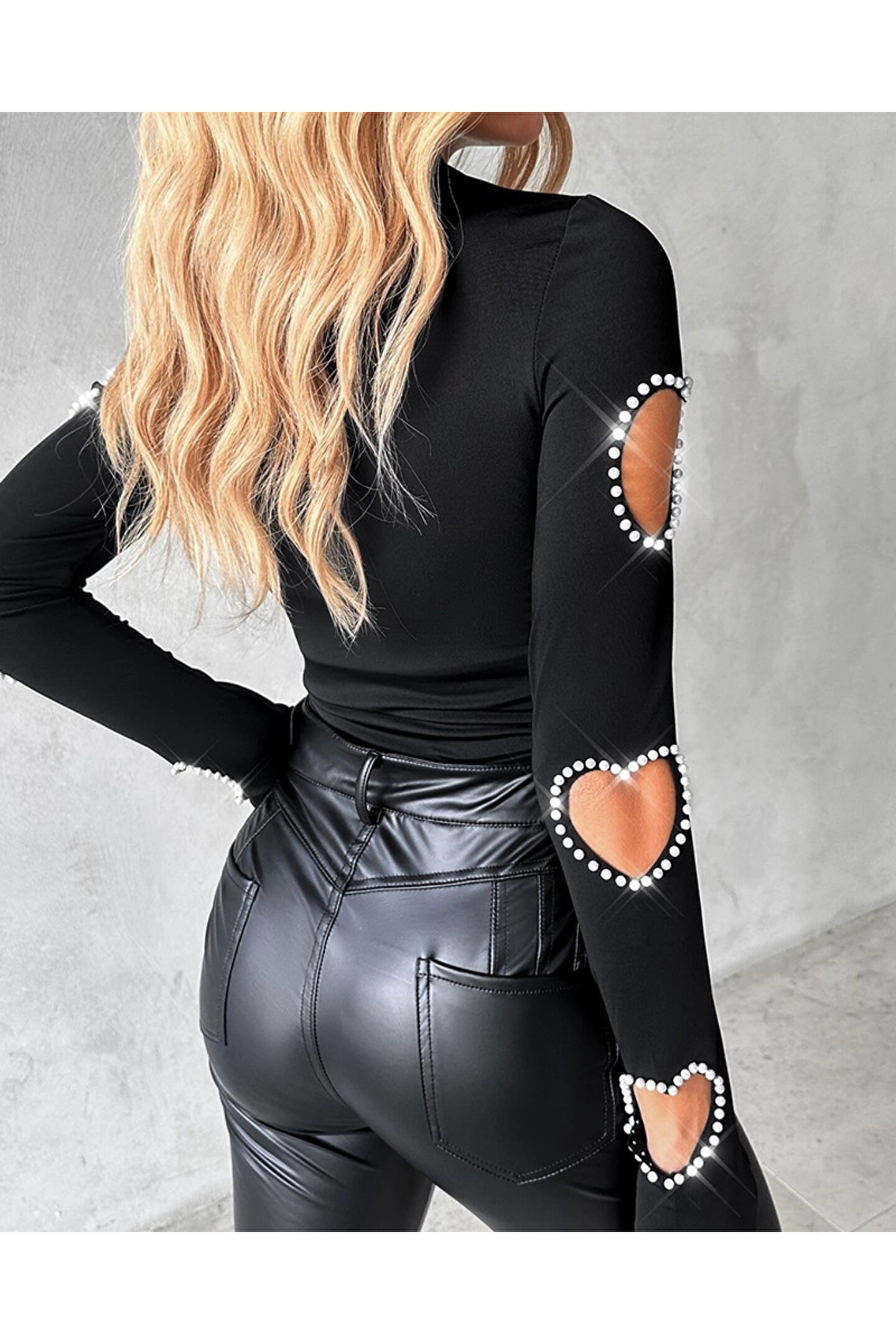 Kadın Uzun Kollu Yarı Balıkçı Yaka Pencere Detaylı Kolları Kalp Desen Taşlı Viskon Bluz