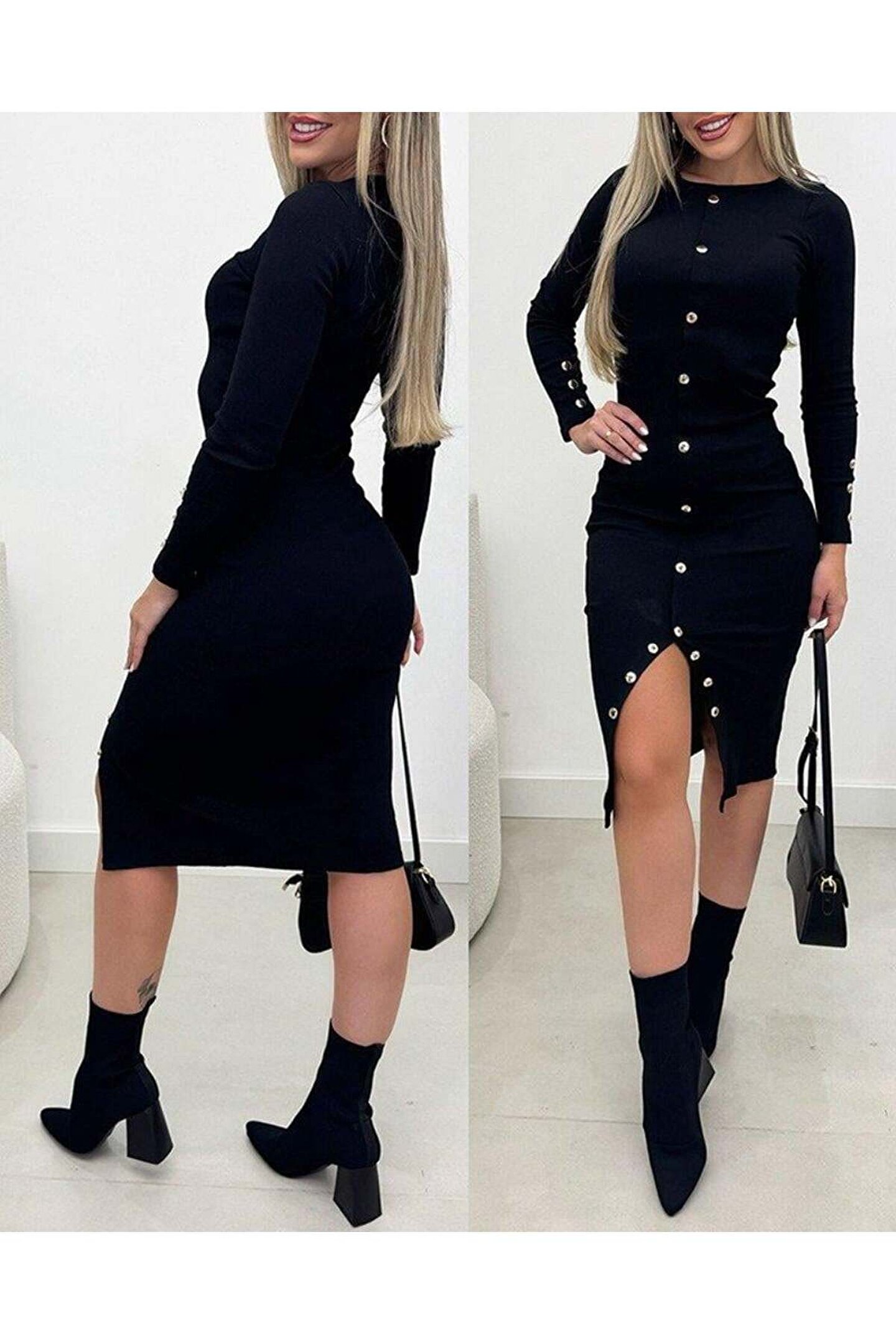 Kadın Uzun Kollu Yırtmaçlı Düğme Detaylı Midi Kaşkorse Elbise