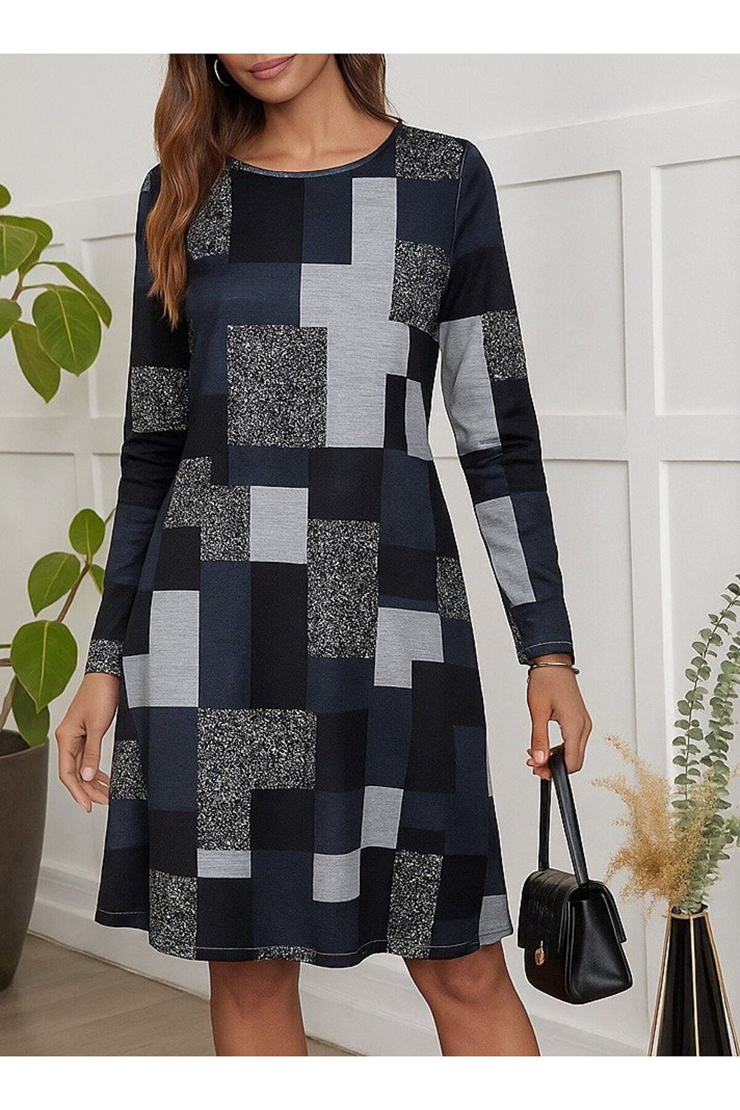 Kadın Uzun Kollu Yuvarlak Yaka Geometrik Süprem Elbise
