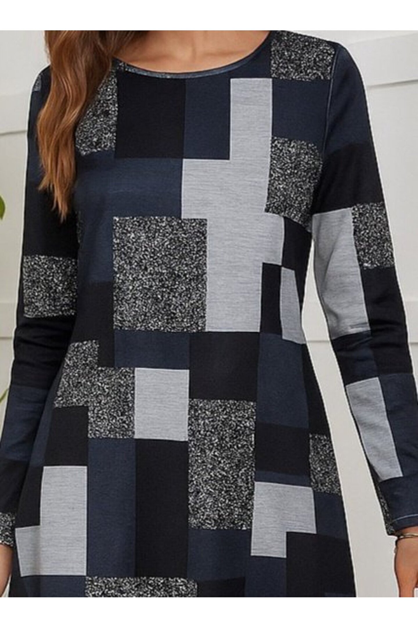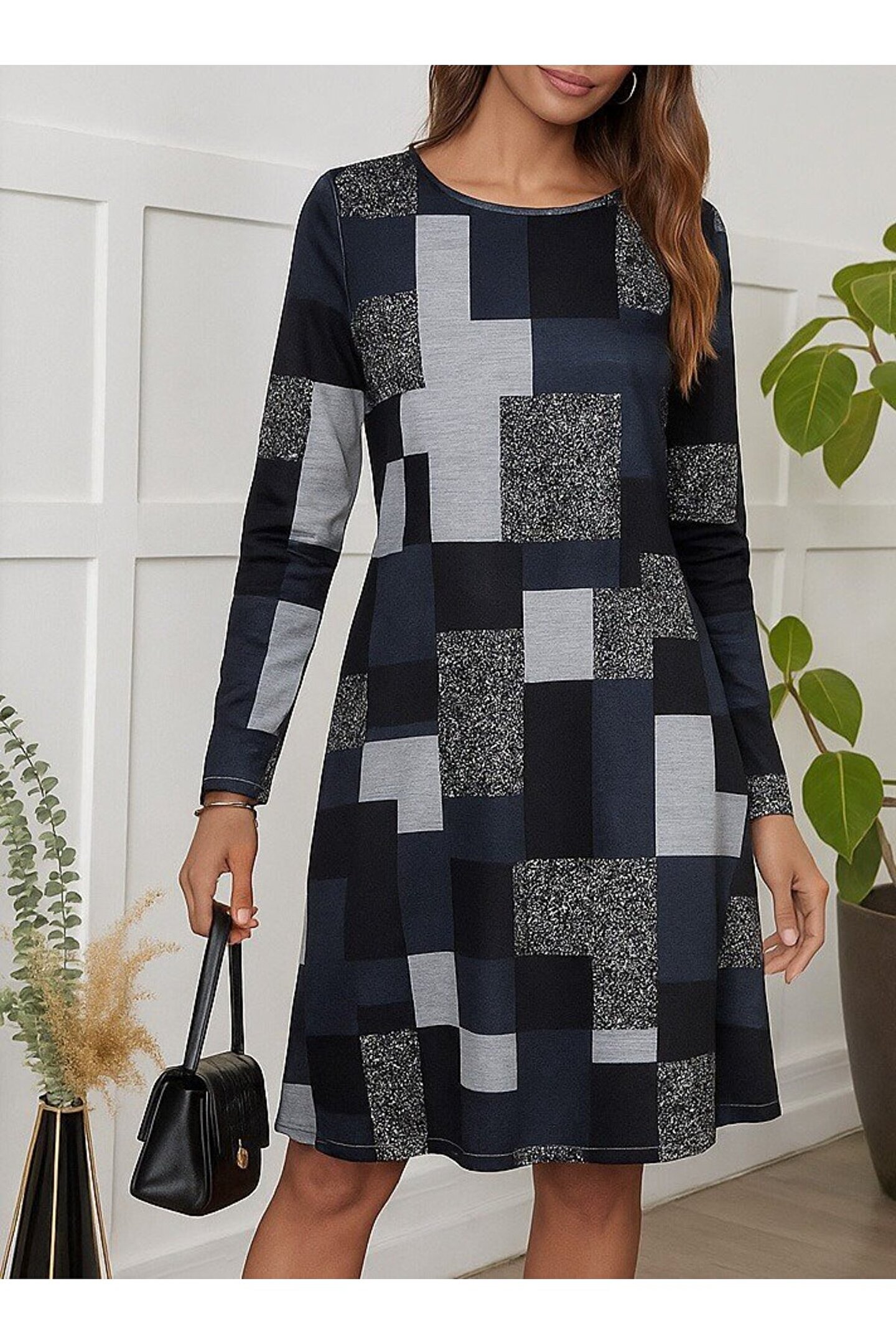 Kadın Uzun Kollu Yuvarlak Yaka Geometrik Süprem Elbise