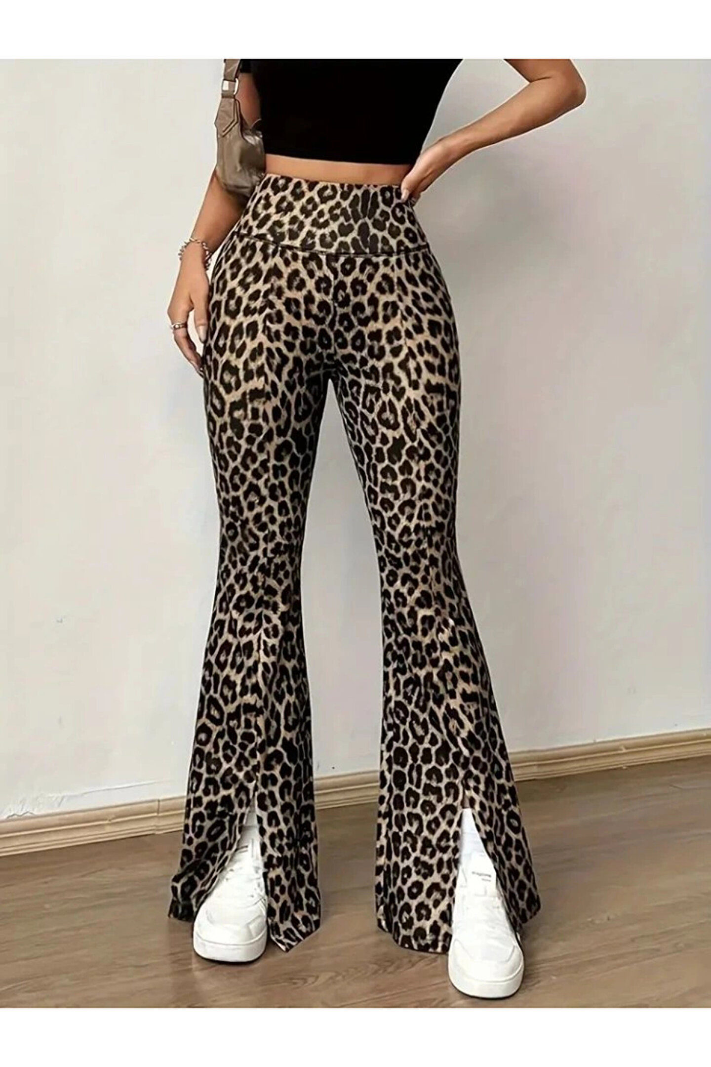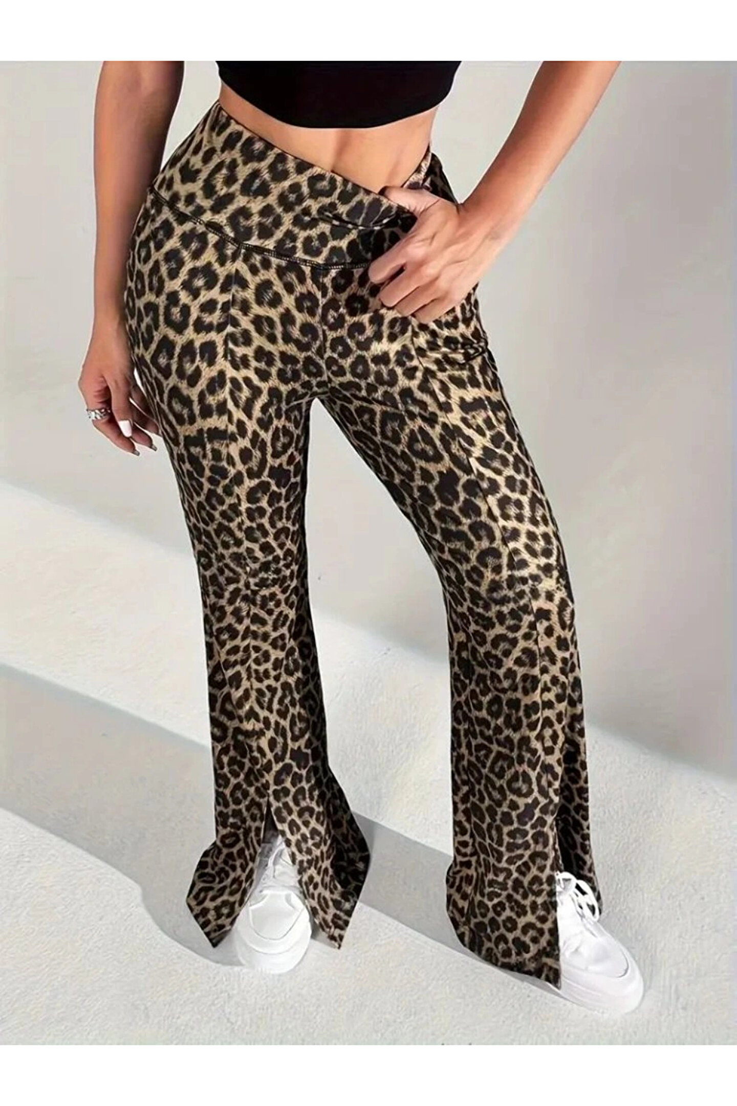 Kadın Yüksek Bel Leopar Desenli Yırtmaçlı Dalgıç Tayt