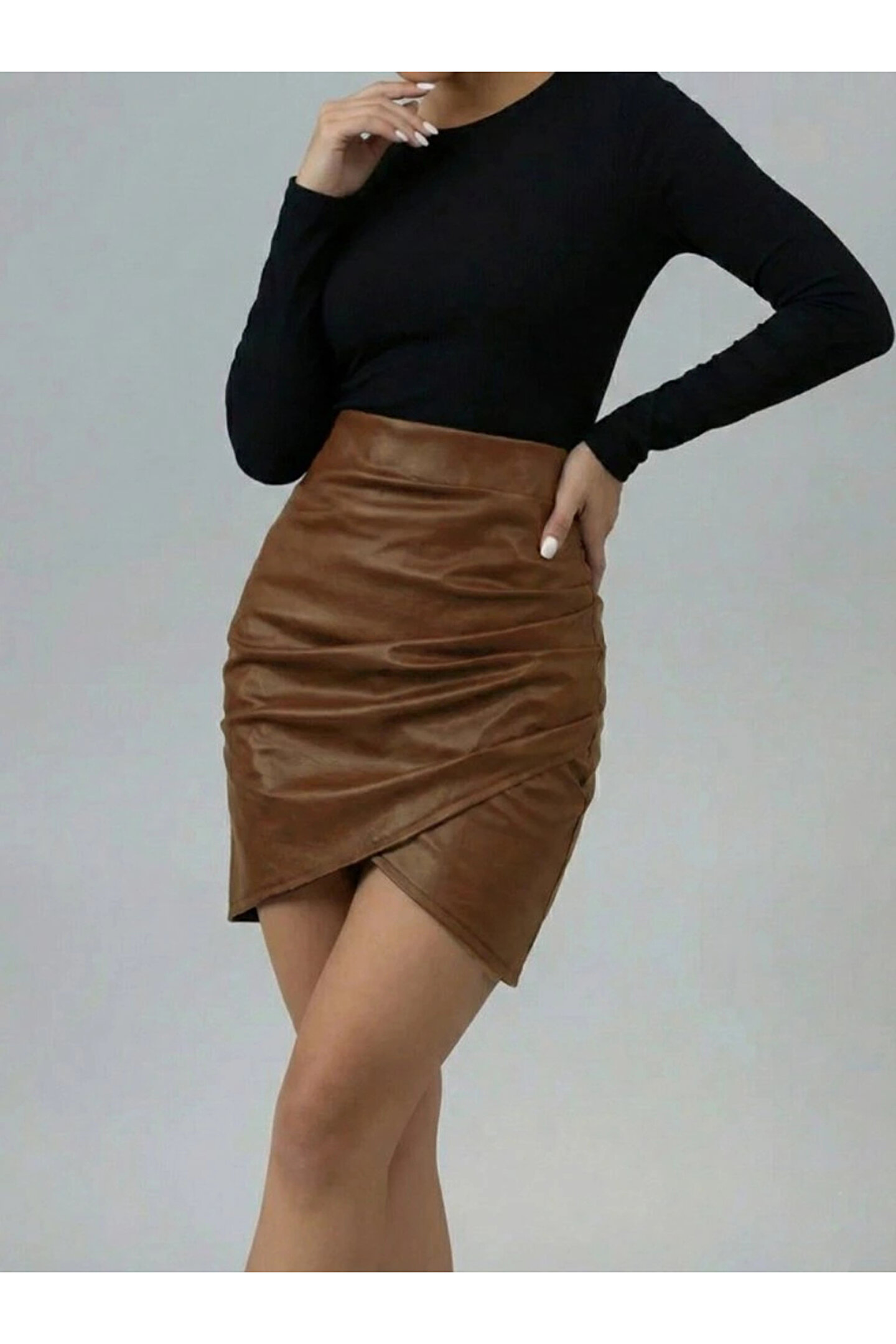 Kadın Yüksek Bel Yandan Fermuarlı Pileli Mini Deri Etek