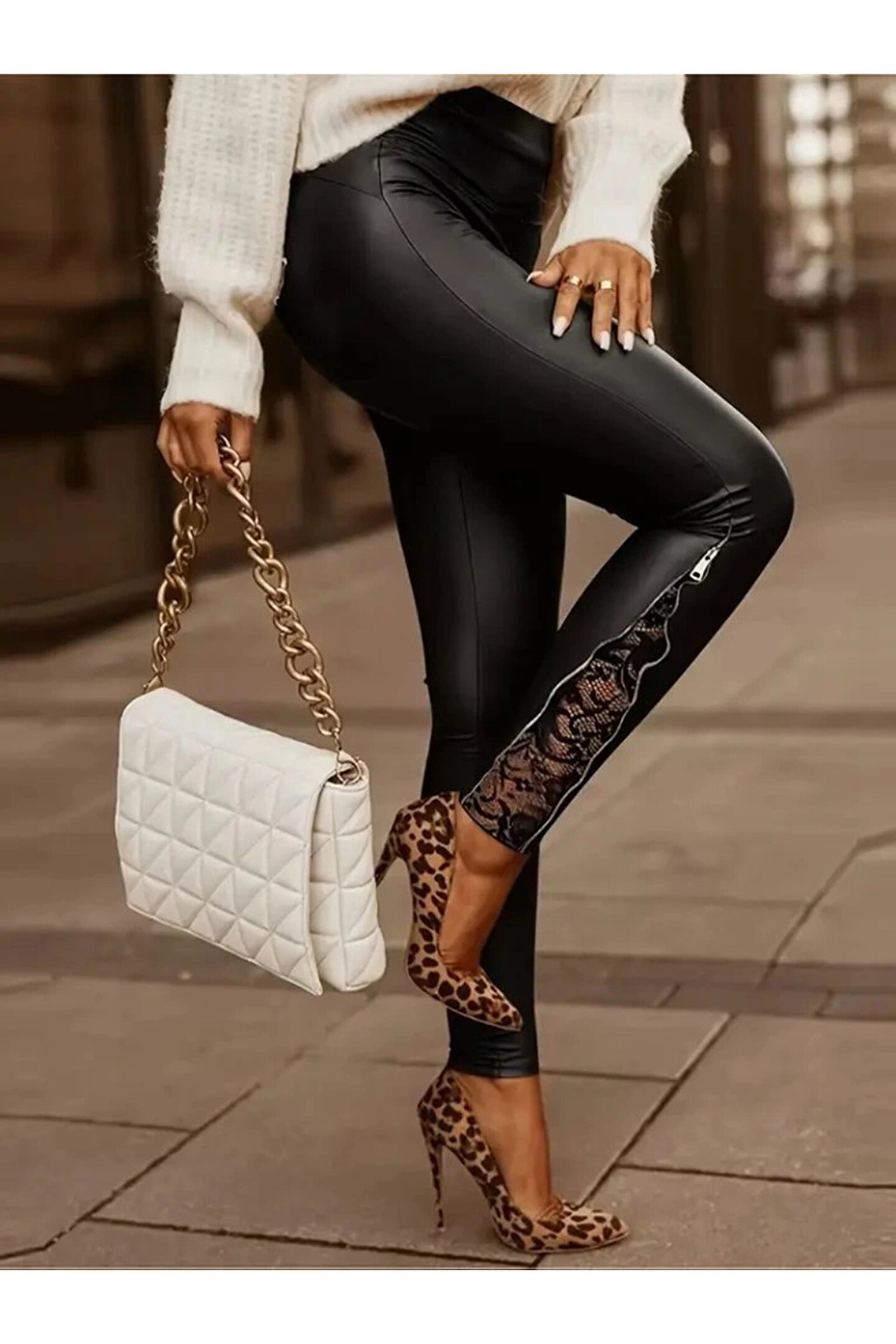 Silerra Kadın Yüksek Bel Yandan Yırtmaçlı Dantel Detaylı Deri Tayt