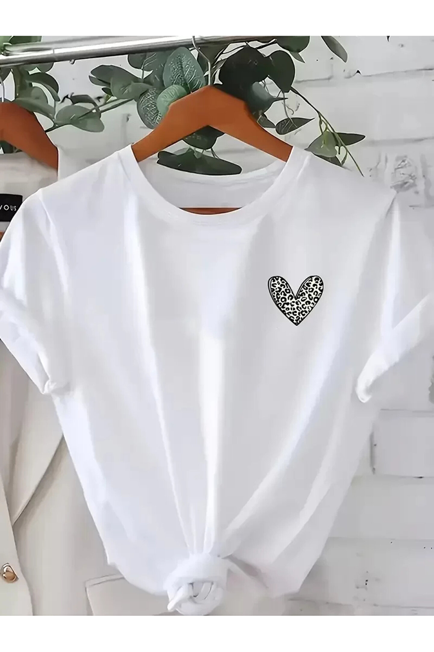 Kadınlar için Şık Leopar Kalp Baskılı Günlük Tişört - Büyük Beden, Makinede Yıkanabilir, Sevgililer Günü & Günlük Kıyafetler için Mükemmel- Beyaz
