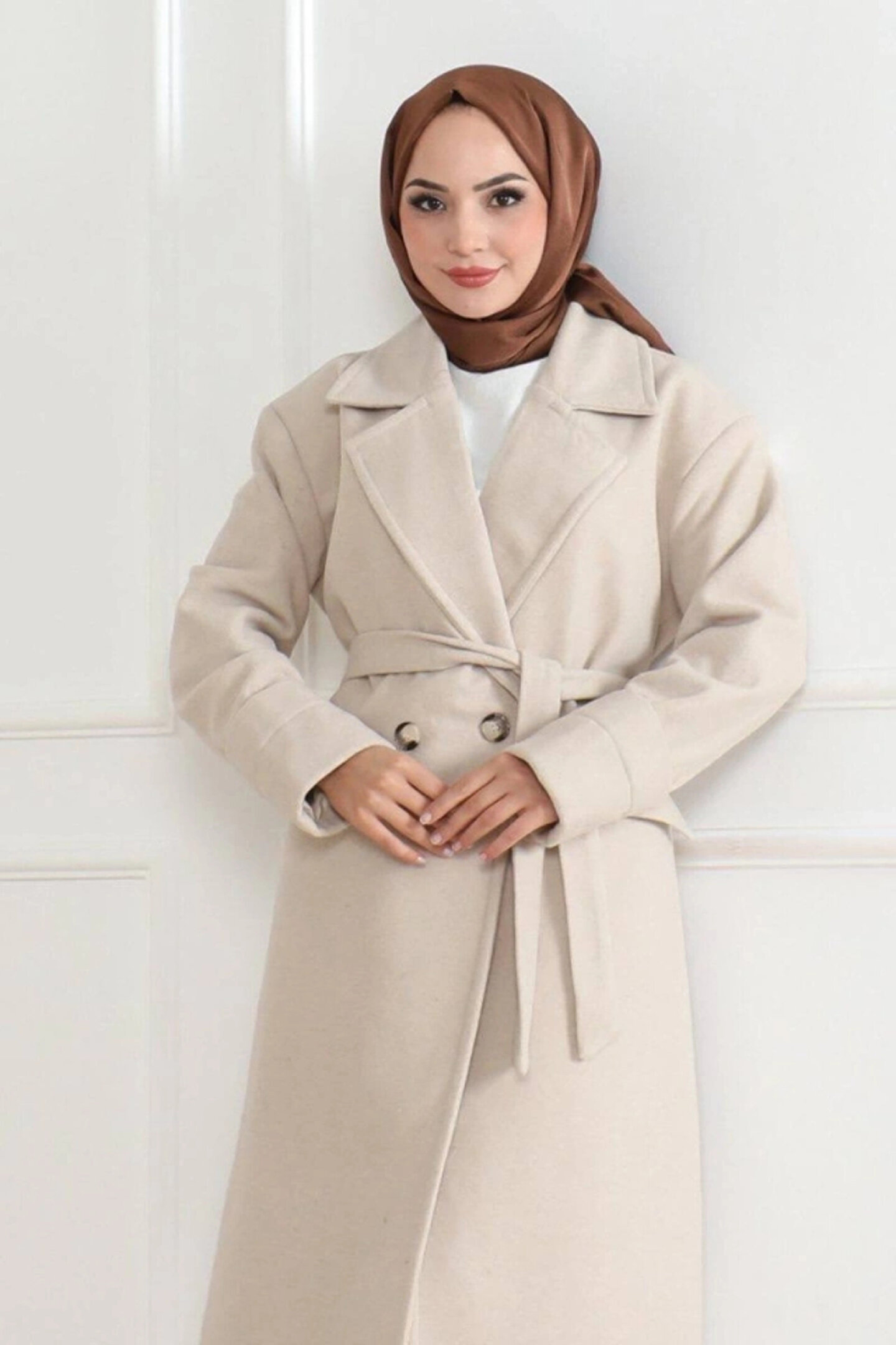 Kaşe Kaban – Uzun Boy Kruvaze Yaka Kuşaklı Tesettür Kaşe Kışlık Kaban, Astarlı Şık Yünlü Dokuma Oversize Rahat Kalıp Cepli Düğmeli Modern Kap Modeli - Bej